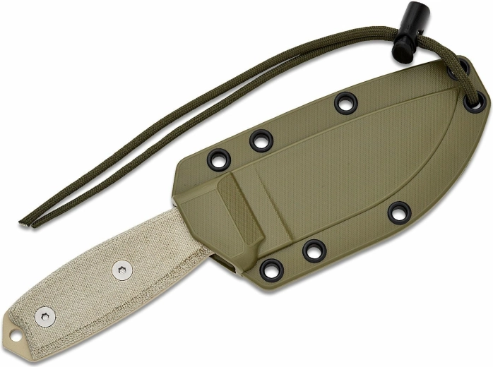 The sand-brown Micarta handle provides a secure grip even with gloves and in wet conditions. The handle butt features a hole for threading paracord and a practical glass breaker. The package includes a green plastic OD Green sheath that protects the blade and enables comfortable carry.
