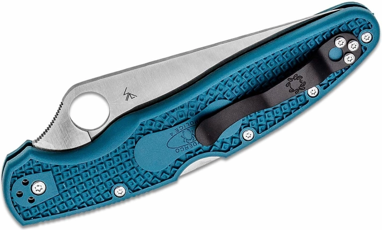 The blade opens via Spyderco’s signature round hole for fast, confident one-handed deployment. The Backlock ensures secure lockup during work. The textured FRN handle in blue is light, durable, and fits the hand well, even when wet. The knife is completed with a pocket clip and a lanyard hole for flexible carry.