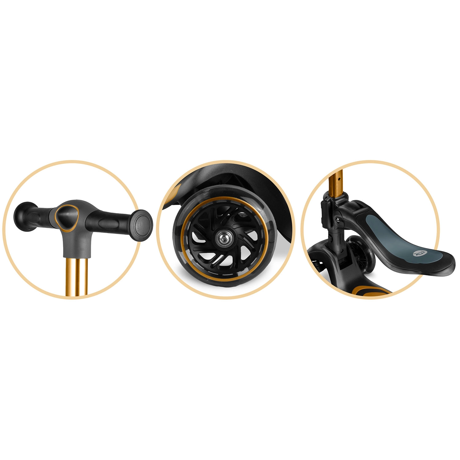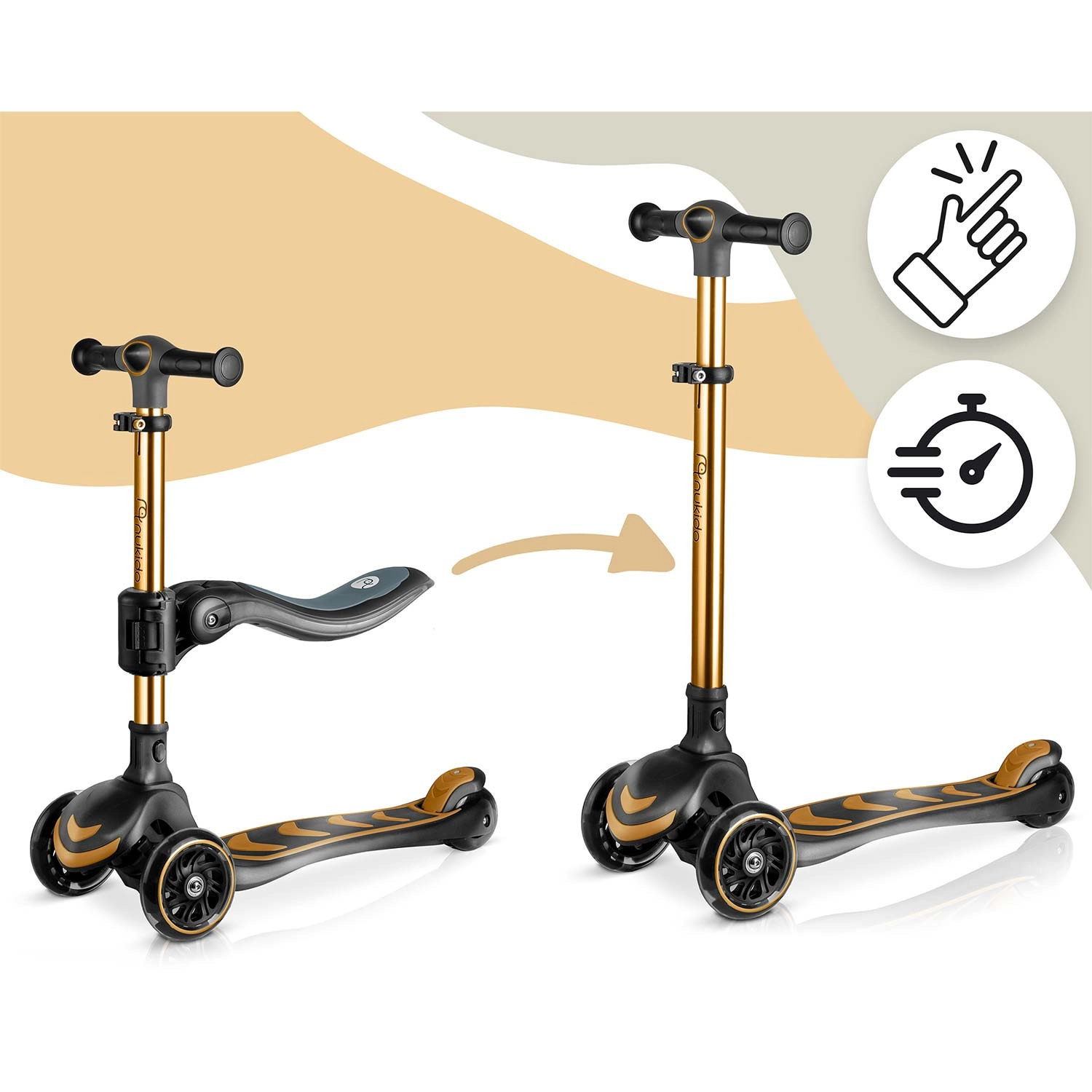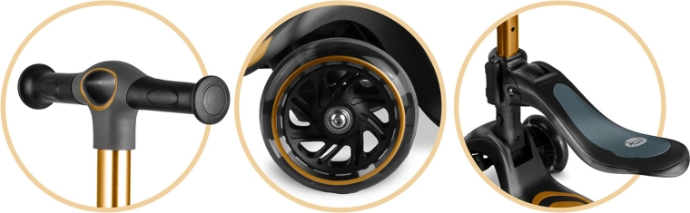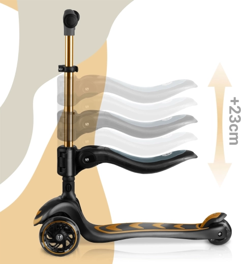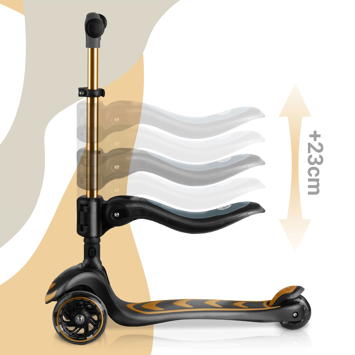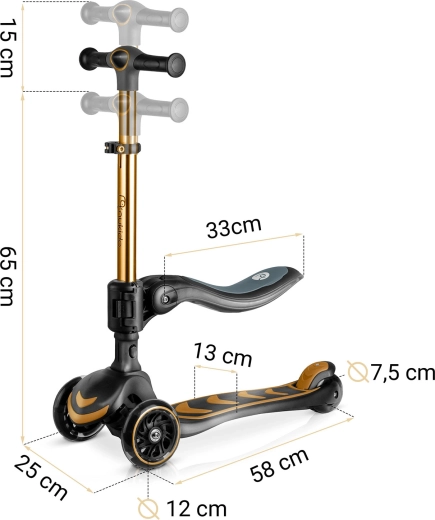 The height-adjustable T-bar and removable seat with 3-step height regulation enable an easy transition from ride-on to scooter. One toy for many years of joy.