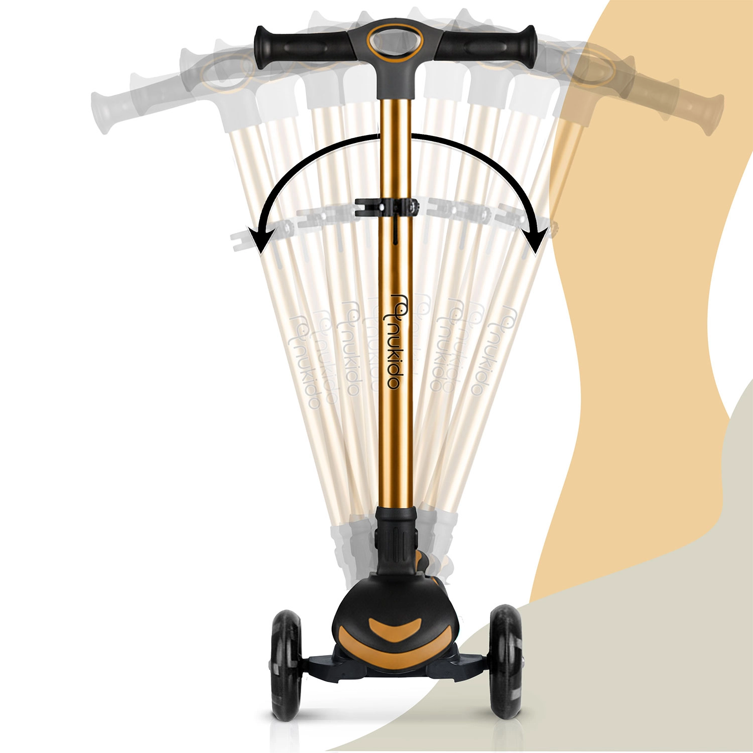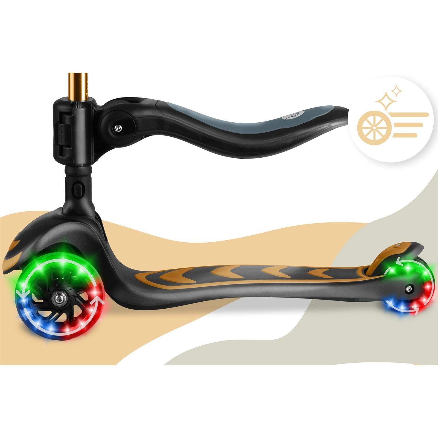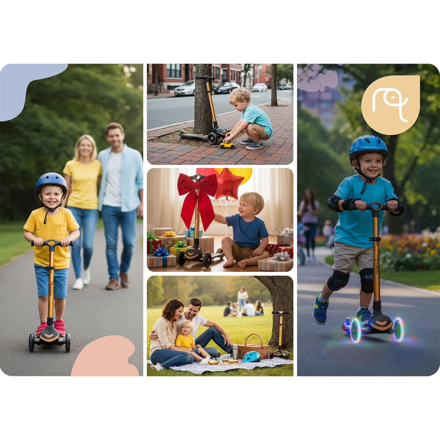 NUKIDO Flippo three-wheel balance scooter with seat offers a stable and fun ride for little riders. Thanks to lean-to-steer control, children intuitively turn by shifting their body weight, while the wide non-slip deck and rear foot brake enhance safety. LED wheels light up while riding without batteries, and the adjustable T-bar handlebar height plus removable seat ensure long-lasting use. The scooter meets European safety standards EN71 and supports up to 50 kg.
