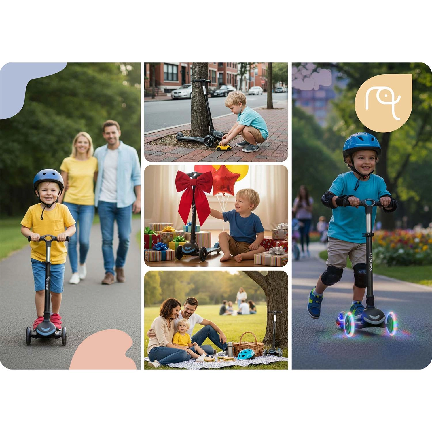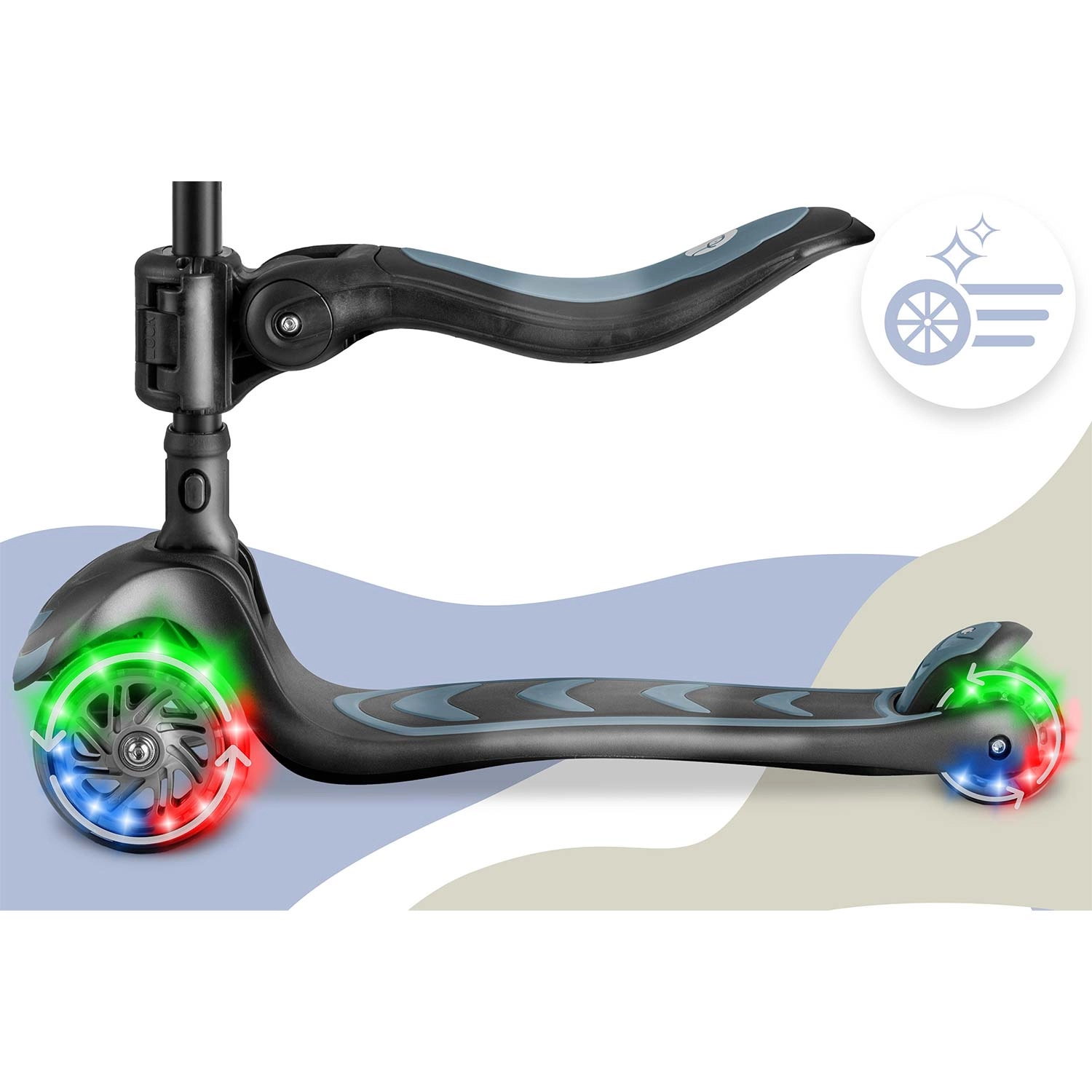 The Nukido Flippo three-wheeled kids’ scooter offers stable lean-to-steer control, a height-adjustable T-handle, and a removable seat for a comfortable start. Thanks to the wide, non-slip deck, foot brake, and LED wheels, riding is fun and safe. The sturdy build with a maximum load of 50 kg meets European safety standards EN71 and is ideal for everyday riding both indoors and outdoors.