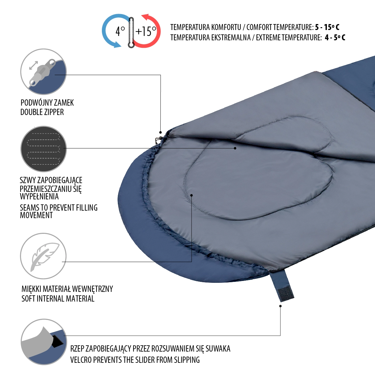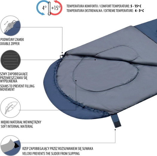 The long two-way zipper along the side and bottom allows you to fully open it into a blanket—an ideal solution for warmer nights. The zipper is secured with a wide flap with hook-and-loop fastening, preventing accidental opening while moving. The hood with a drawstring and cord lock minimizes heat loss and increases comfort in cooler conditions. The sleeping bag comes with a practical carry sack for easy transport.