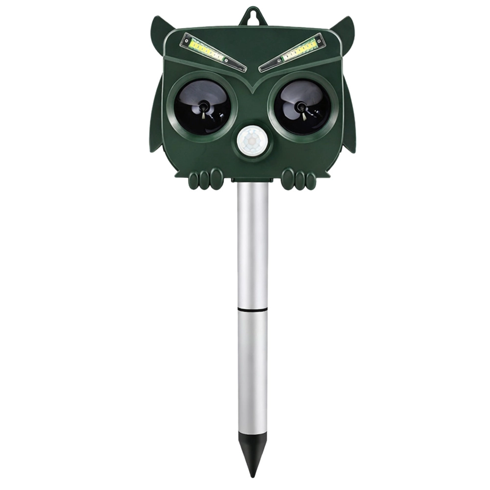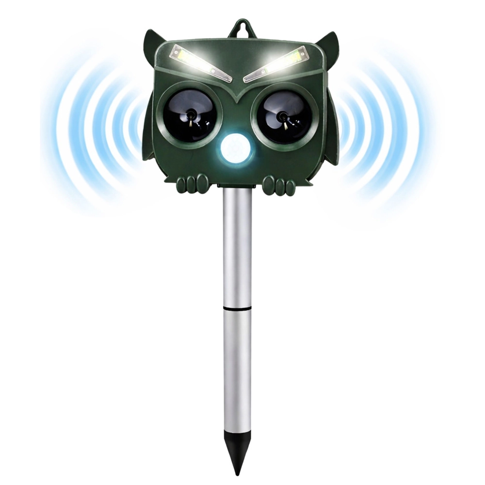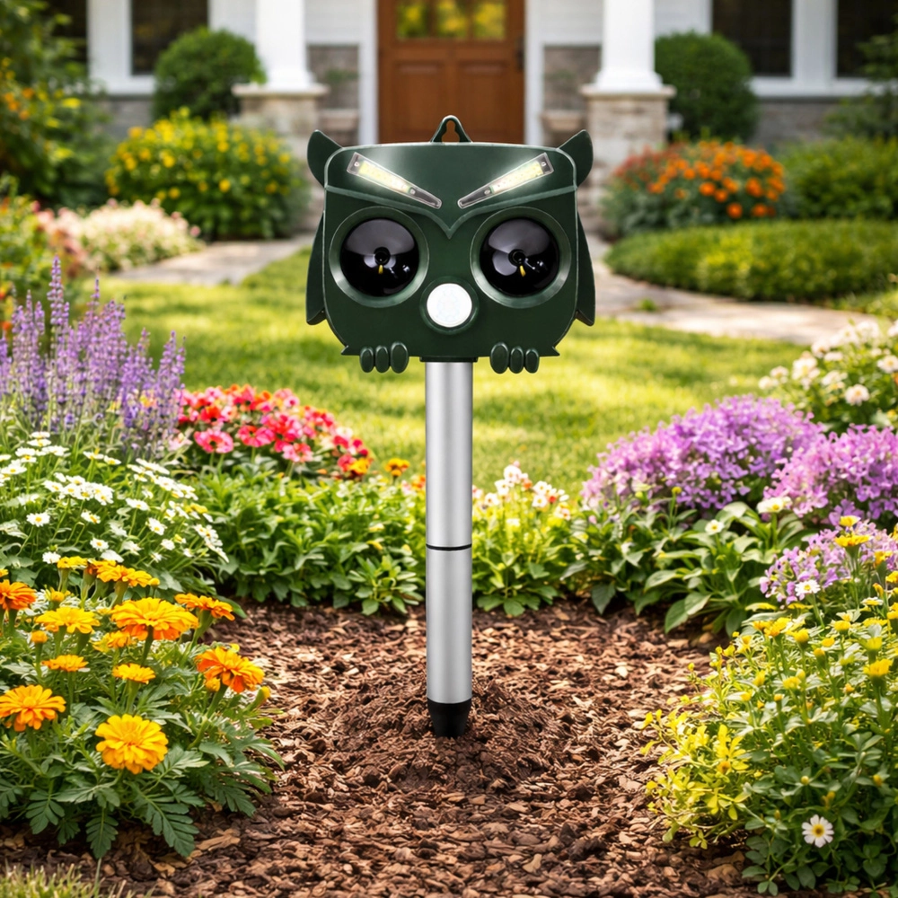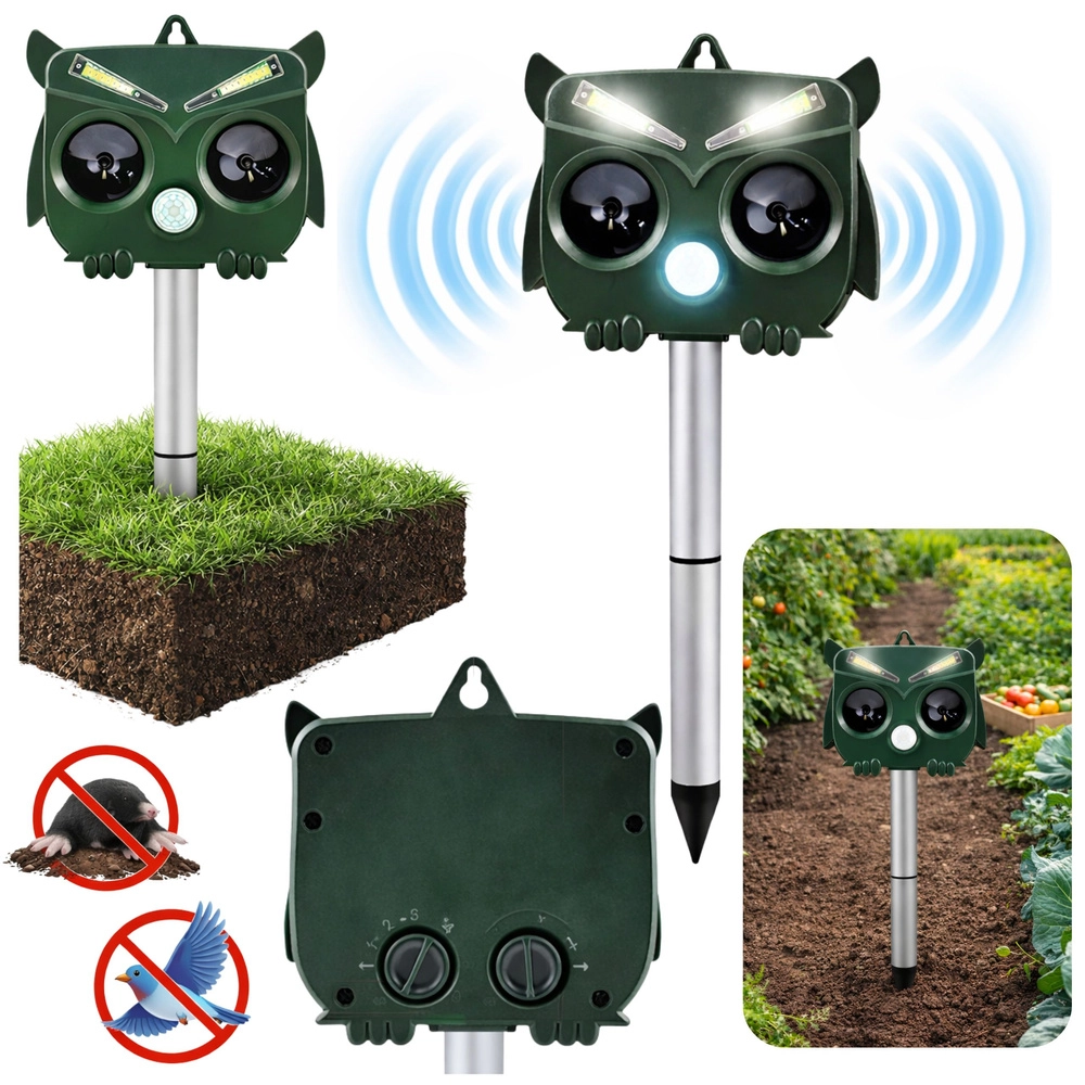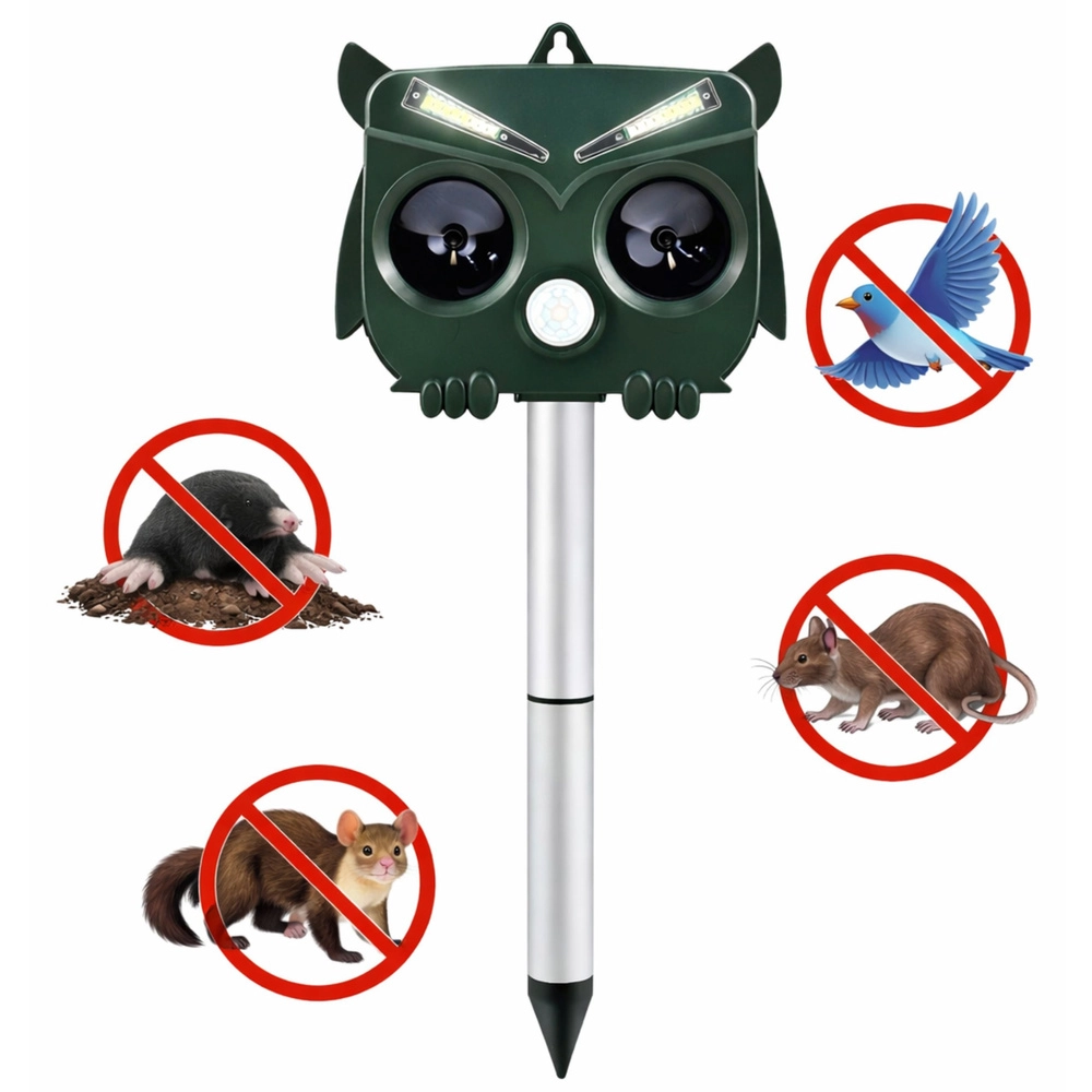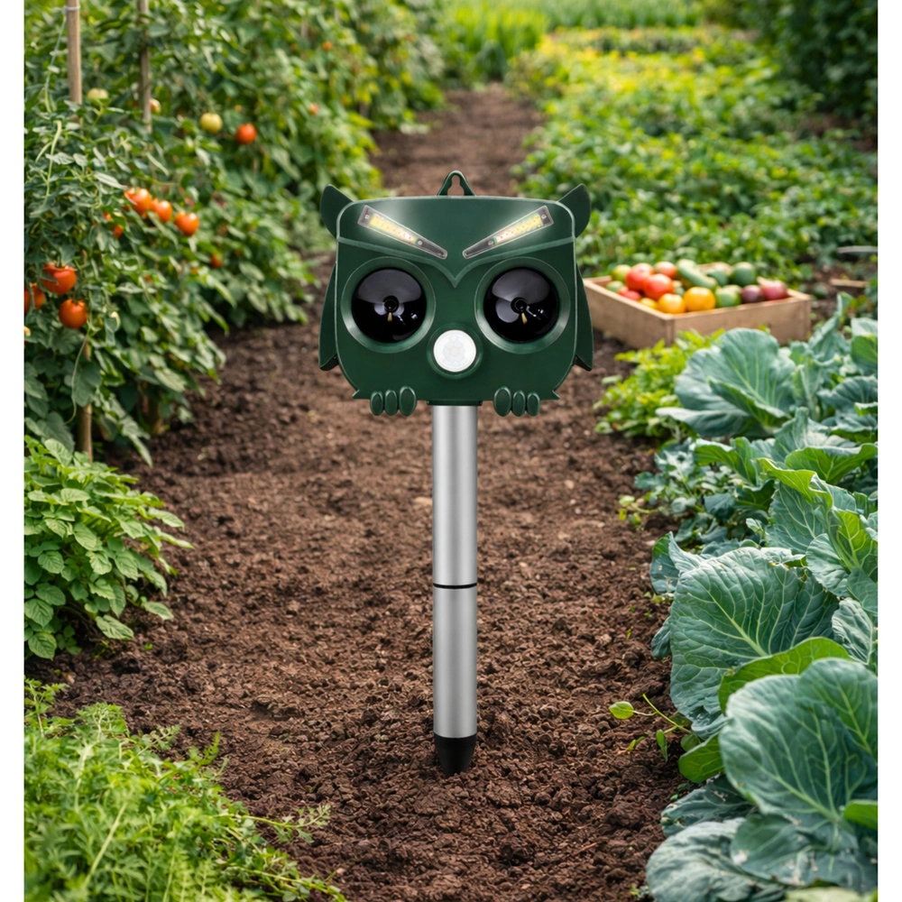 The owl-shaped design looks natural and, combined with ultrasound, sound, and LED flashes, reliably deters unwanted animals without harming their health. The PIR sensor activates the device only when movement is detected, saving energy and extending runtime.