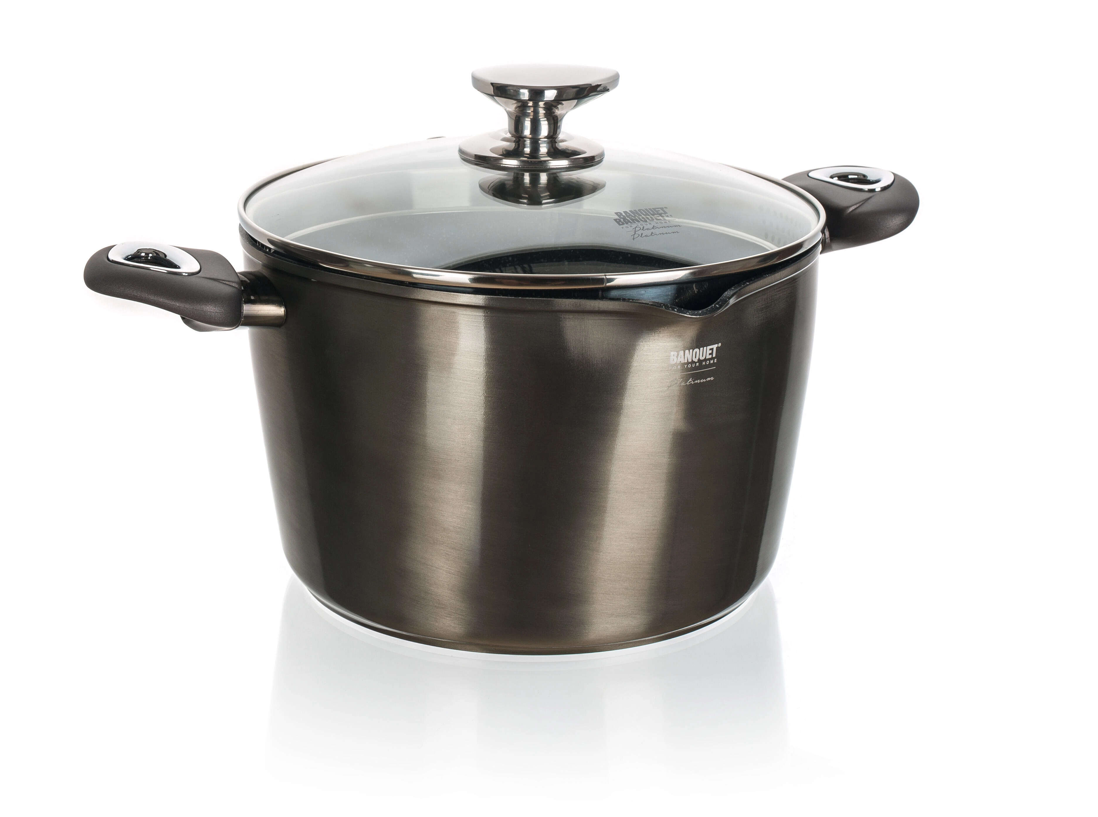 The robust cast aluminum pot METALLIC PLATINUM with a capacity of 6.2 l and a diameter of 24 cm offers a non-stick, highly durable surface, a fully induction-compatible base for fast heating, and a practical spout for easy pouring. The glass lid with a steam vent allows cooking control, while the soft-touch handles and stainless-steel knob ensure comfortable and safe handling.