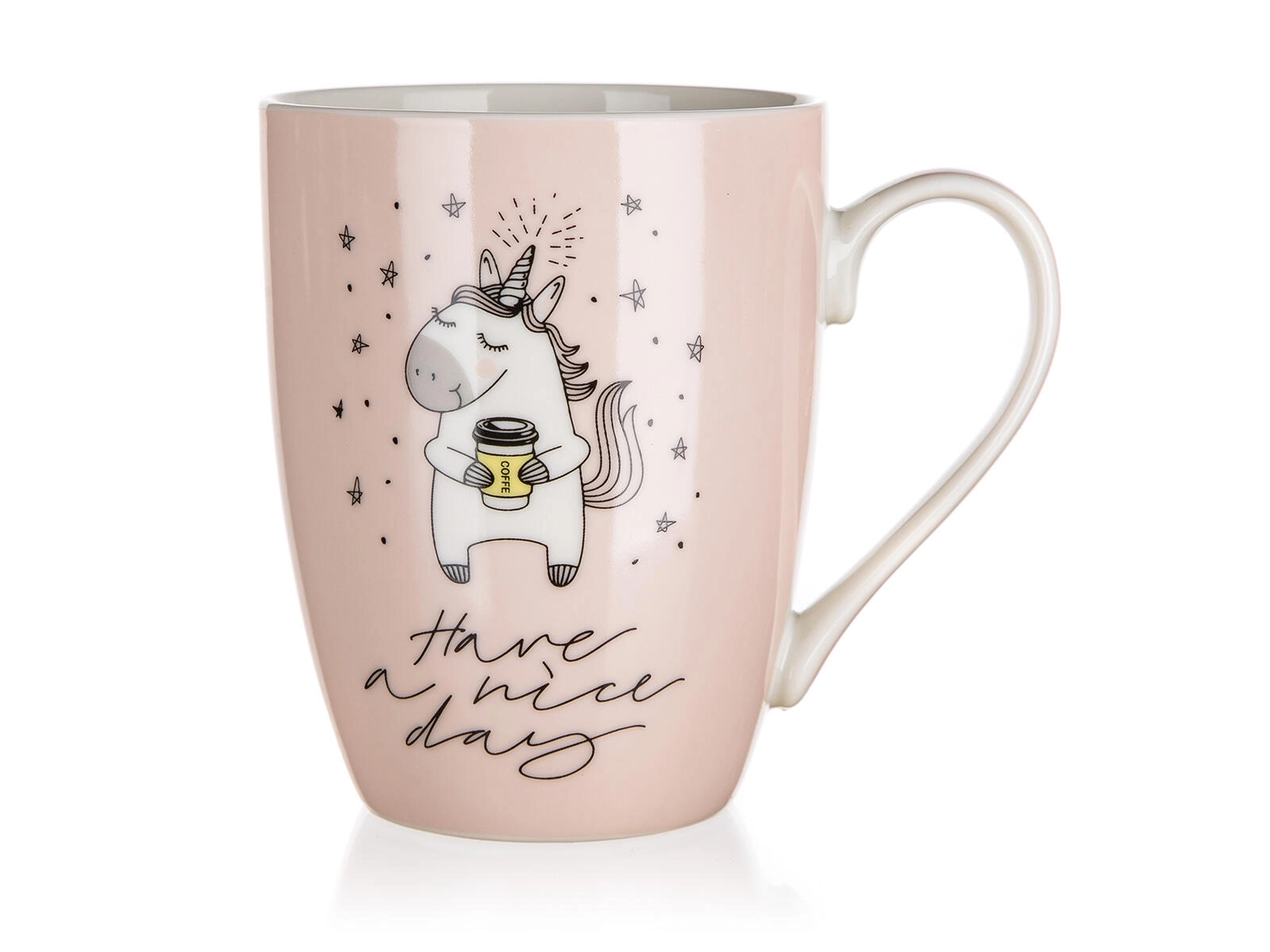 The mug comes in two designs — with the inscriptions “I believe in unicorns” and “Have a nice day.” Top diameter approx. 8 cm, bottom diameter approx. 5.5 cm. Thanks to easy dishwasher care and the option to reheat in the microwave, it’s a practical addition to any kitchen.