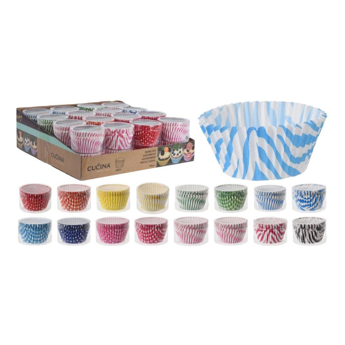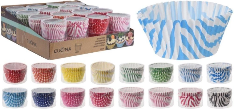 Practical paper baking cups measuring 5 × 3.5 cm in a vibrant mix of polka dots and stripes, ideal for both baking and serving. The pack includes 60 pieces made from high-quality baking paper, perfect for cookies, pralines, chocolate candies, and mini muffins. Create beautifully presented desserts for any occasion with a colorful mix that brightens up any sweet or savory spread.