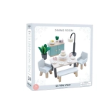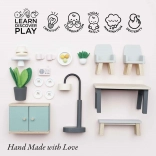 This charming dining set is made from high-quality FSC certified wood and adds a touch of sophistication to any dolls' house. It includes 18 pieces, including a table, two chairs, a bench, a lamp, a sideboard, and decorative accessories like plants, a fruit bowl, and a cake. This set not only looks beautiful but also supports children's cognitive and communication skills. It is decorated with non-toxic water-based paints and is compatible with other Le Toy Van Dolls' Houses.