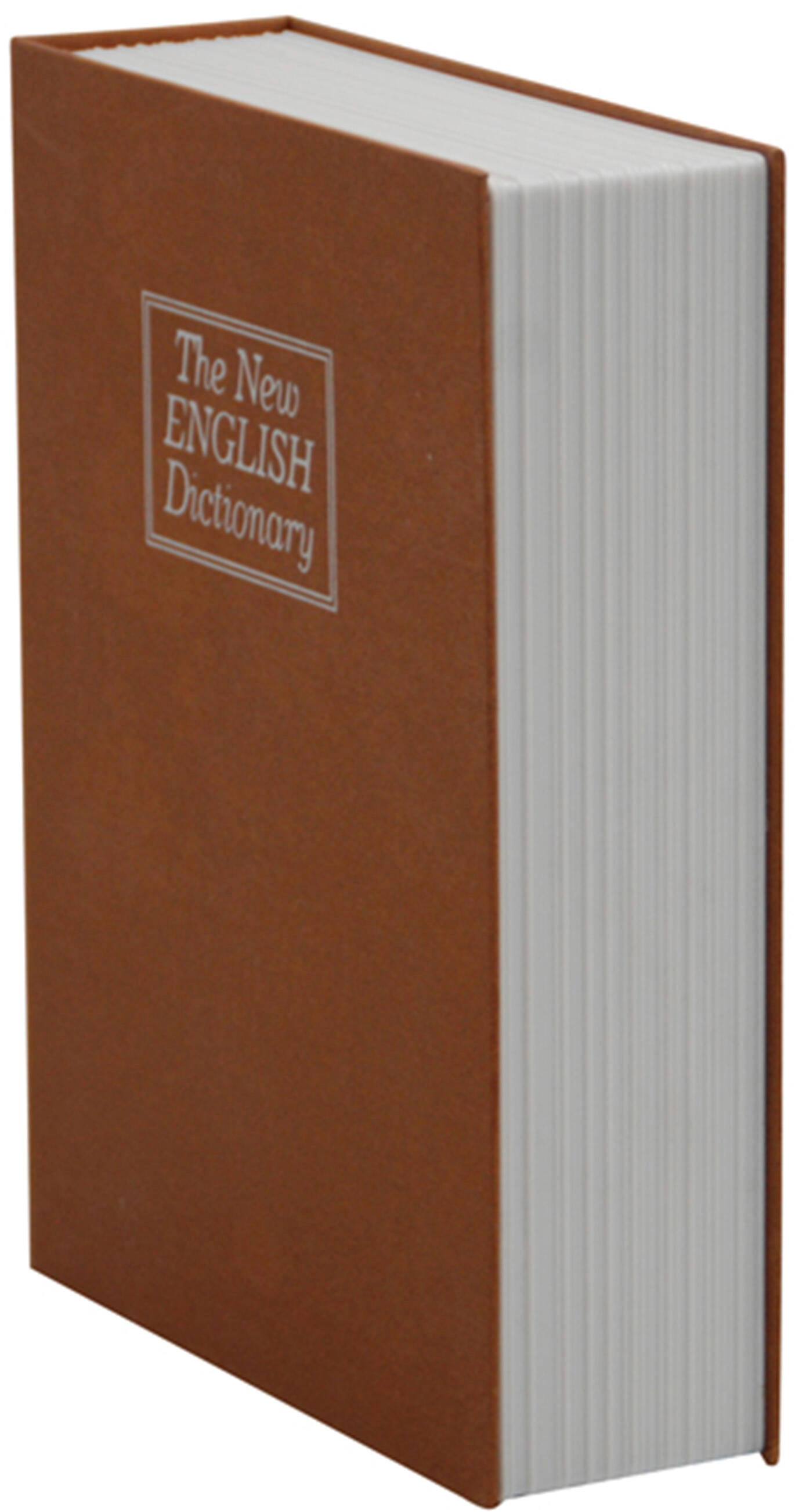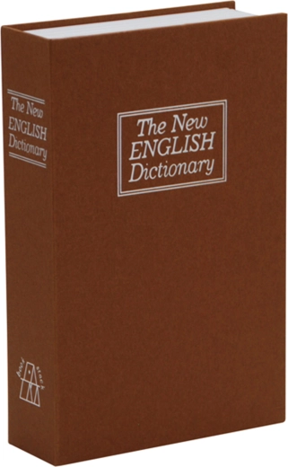 The realistic “The New ENGLISH Dictionary” appearance blends in with other books, keeping the safe hidden in plain sight.