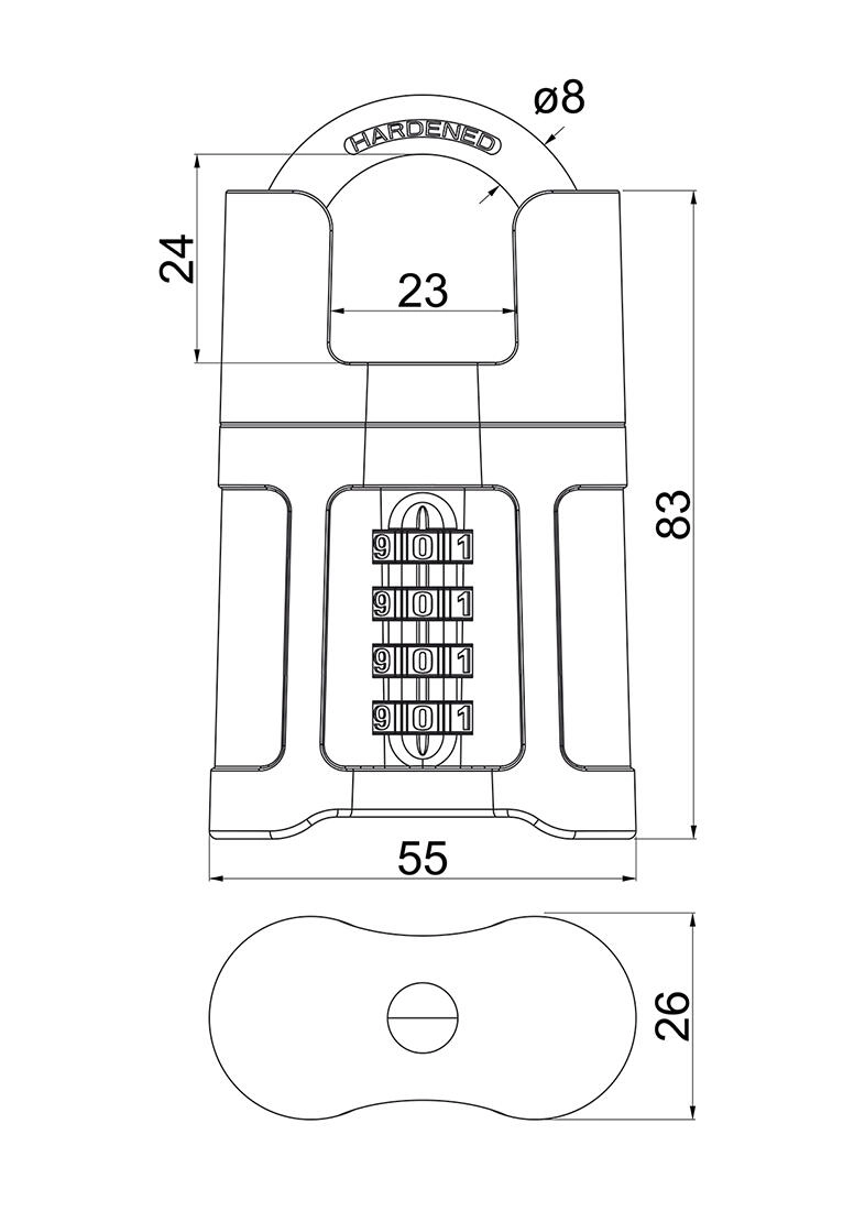 A reliable combination padlock in an elegant black finish combines a durable zinc-alloy construction and a HARDENED shackle with a shackle cover for better protection against prying. Thanks to the custom numeric combination, which you can change at any time, you keep security fully under control.