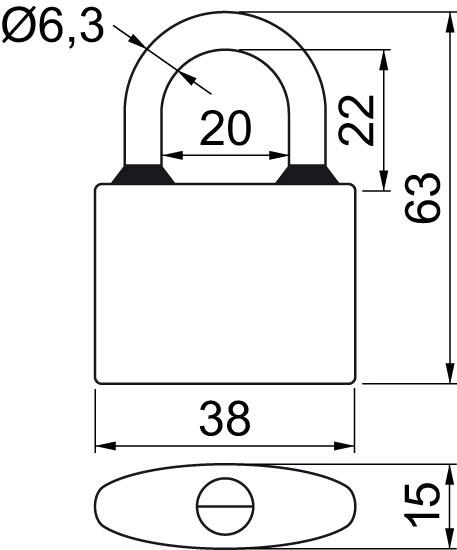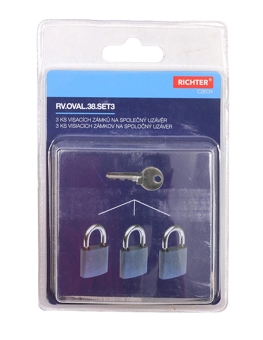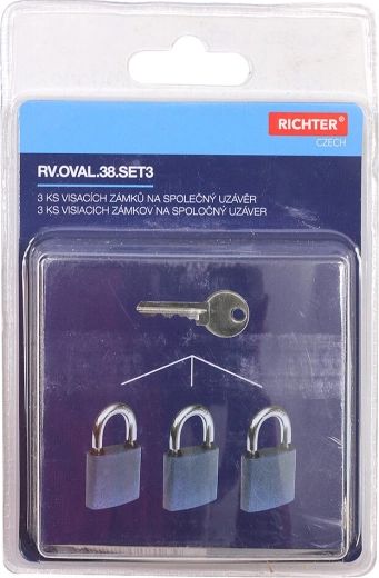 Practical set of three OVAL 38 padlocks with a keyed alike (KA) system for convenient locking with a single key. Durable cast iron body, reinforced HARDENED shackle secured at two points, and rubber rings against water ingress ensure long service life. Self-locking by pressing the shackle and a 5-pin cylinder for enhanced security.