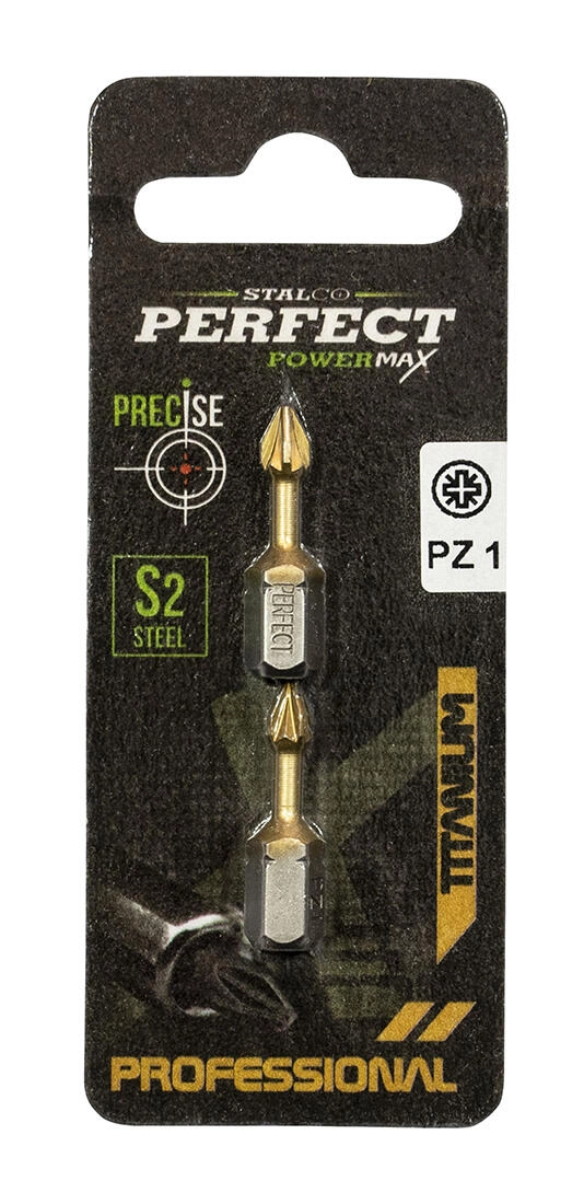 High-quality titanium Pozidriv bit PZ1 with a length of 25 mm from STALCO, designed for precise screwing with cordless screwdrivers. Offers high durability, long service life, and reliable torque transfer. Practical packaging includes 2 pieces in a blister.