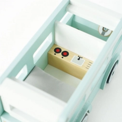 Embark on imaginative adventures with the Vintage Caravan Playset by Le Toy Van. This charming caravan is painted in soothing pastel mint, cream, and white colors, designed to spark creativity and transport little ones on surf trips, bike tours, or road journeys across Europe. The set features a removable roof for easy access, a cozy mattress inside, and even includes a surfboard alongside an array of beautifully painted details.
