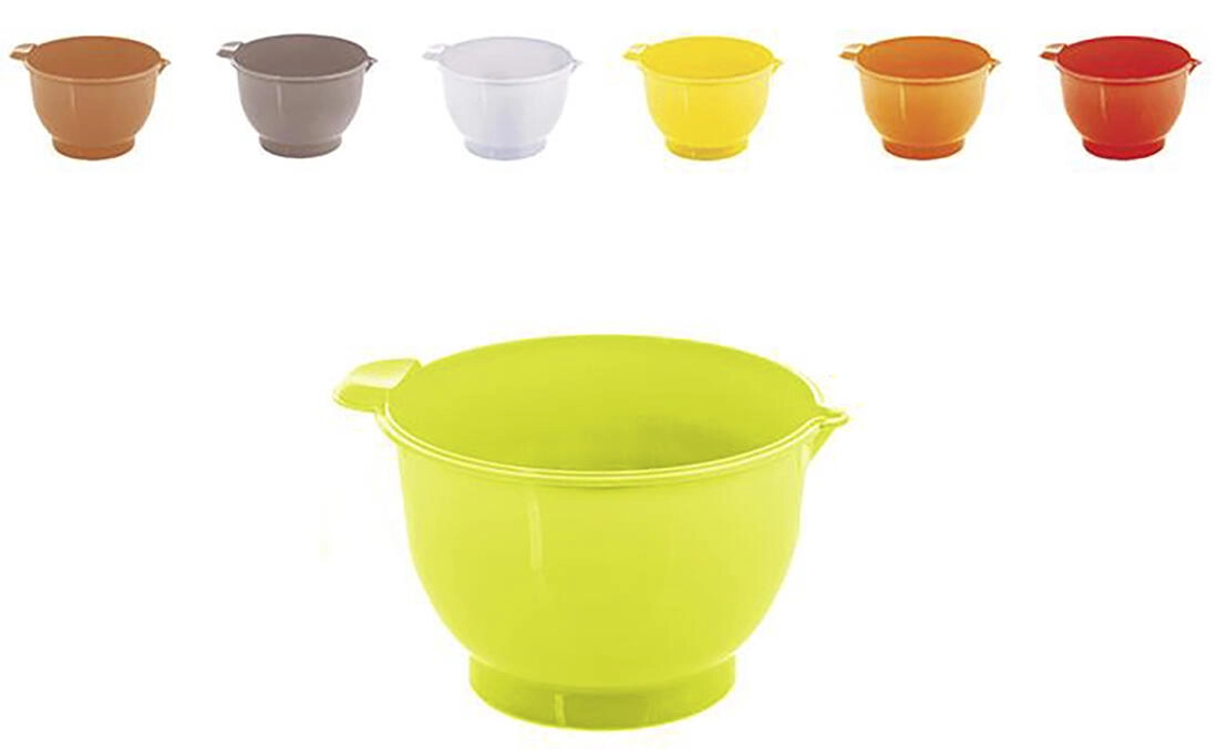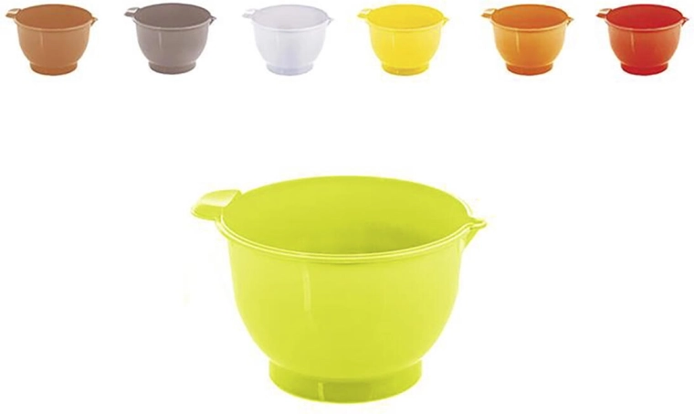 Practical 2 L whisking bowl made of durable plastic with a non-slip rubber base for stability while you work. The integrated spout makes pouring batters and creams easy and mess-free. Ideal for everyday baking and for preparing creams or egg-white meringue. Stable, lightweight, and easy to clean design in assorted colors.