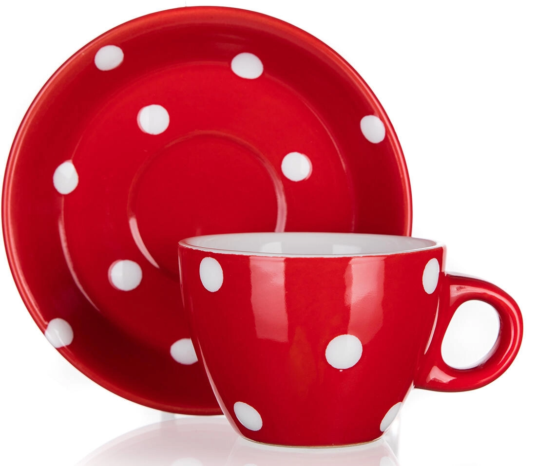 Stylish ceramic cup with saucer with a capacity of 100 ml in red with white polka dots is a joy for everyday use. Thanks to the durable material, it is microwave-safe and dishwasher-safe, so you can enjoy your favorite coffee or espresso comfortably and without worries.