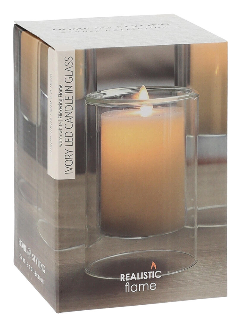 This stylish LED candle measuring 10 × 15 cm is enclosed in a clear glass casing that highlights its modern look. The soft Ivory color suits any interior and easily pairs with other decor.