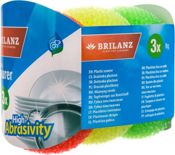 A practical set of plastic scouring pads in a mix of colors for everyday kitchen cleaning. Ideal for gentle yet effective cleaning of dishes and kitchen surfaces. Removes stubborn dirt without scratching delicate surfaces, lightweight and comfortable to hold, pack of 3 for longer use.