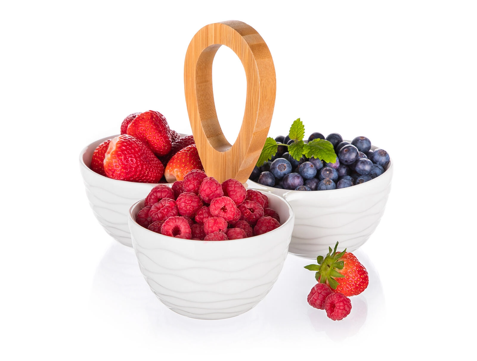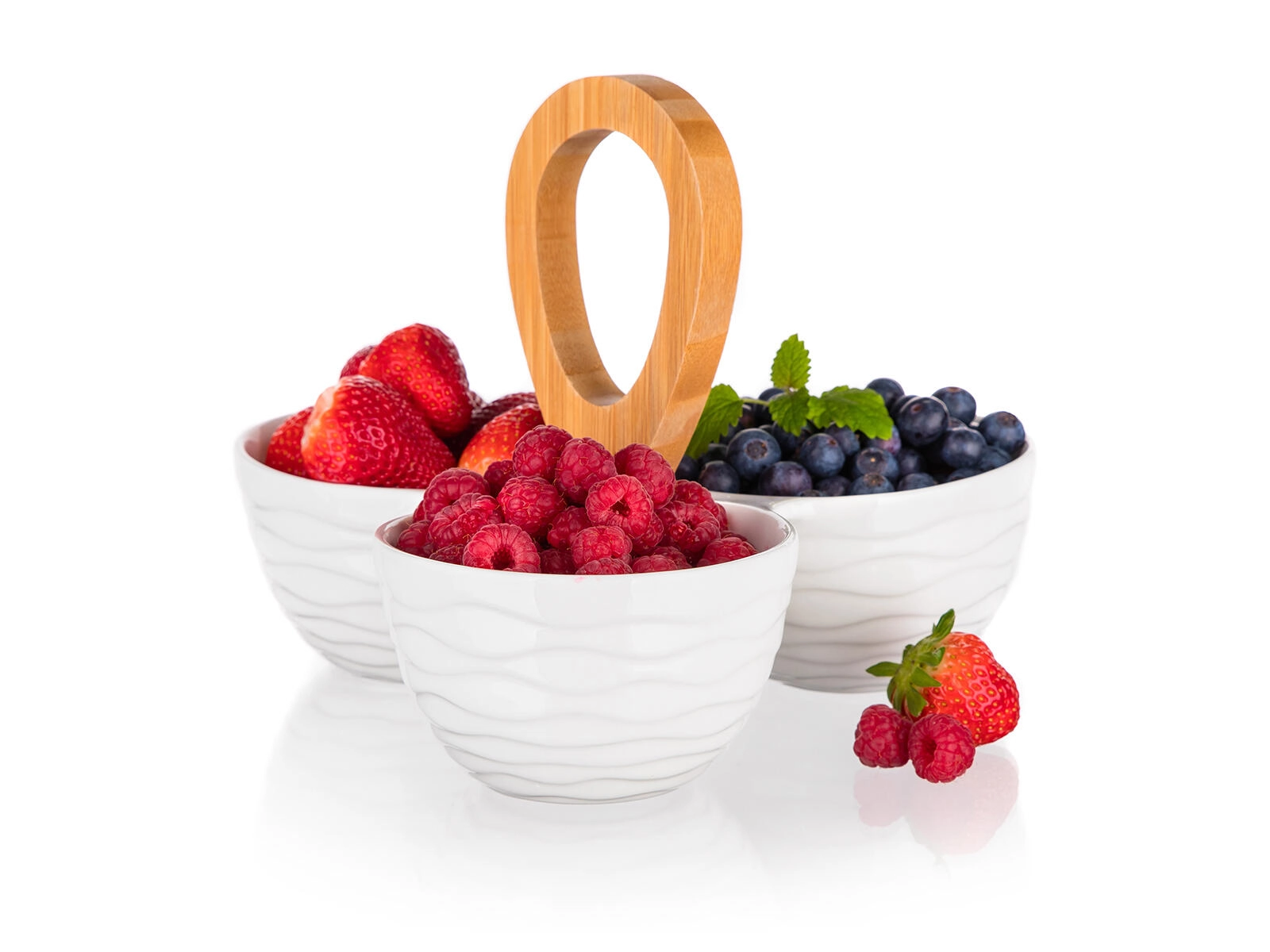 Discover a practical and stylish solution for everyday dining and festive entertaining. Three white porcelain bowls with a delicate wavy relief are arranged around a sturdy bamboo handle, making it easy to carry and serve at the table. The set is perfect for nuts, olives, dried fruit, dips, or small sweets.
