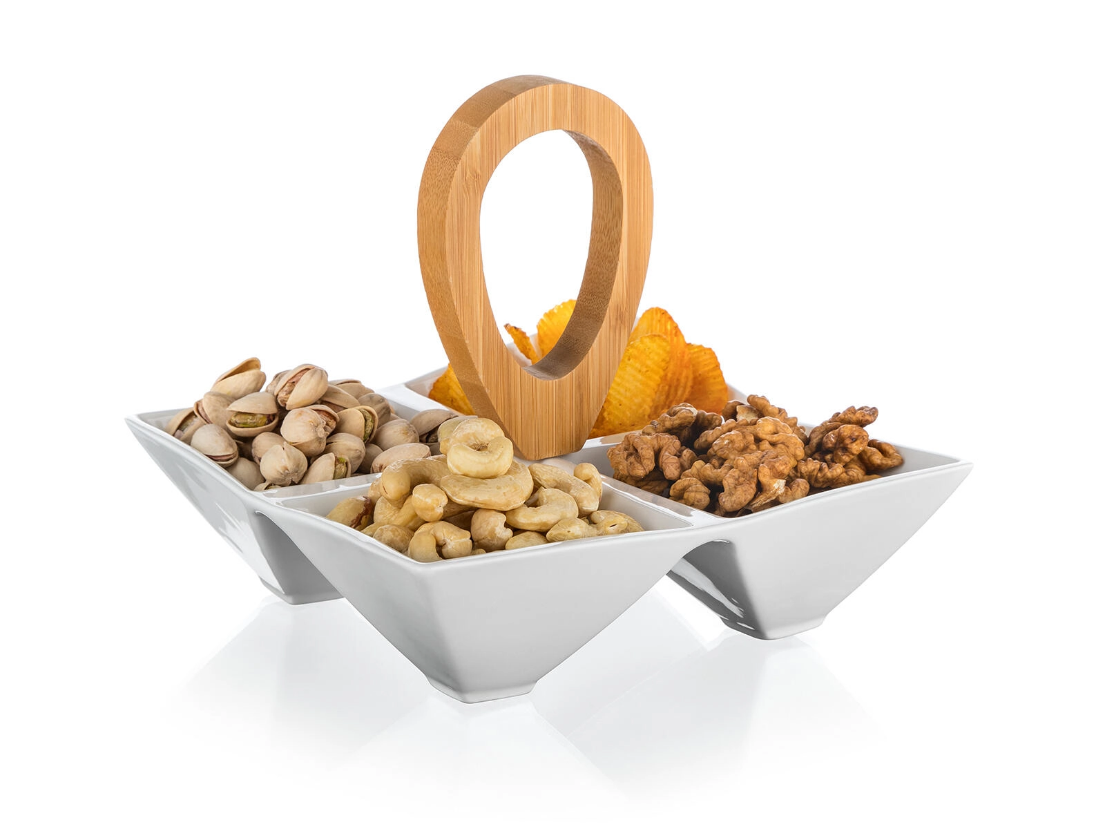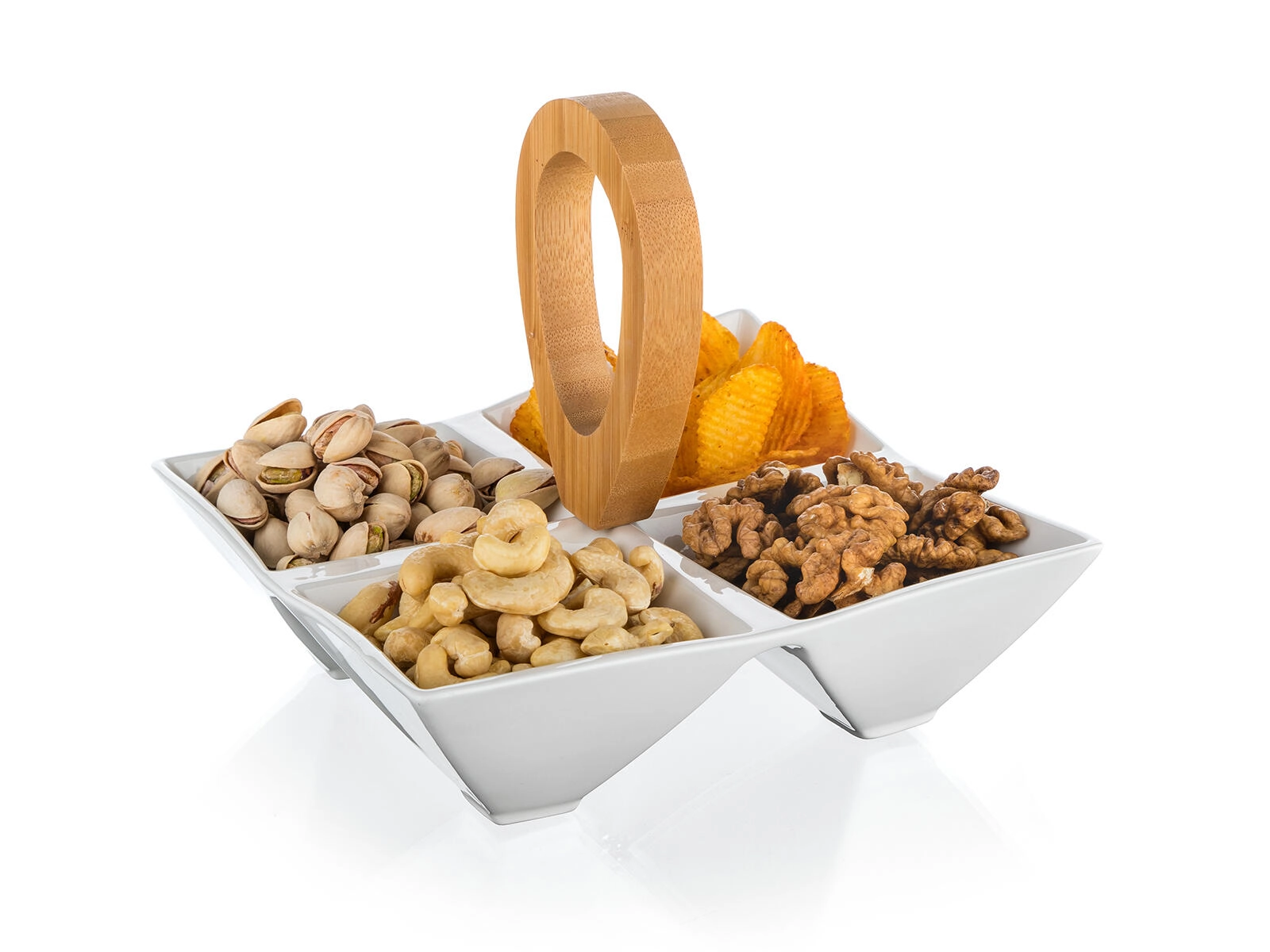 A stylish serving bowl with four separate compartments combining high-quality white porcelain and a natural bamboo handle for easy carrying. Ideal for nuts, olives, dips, and dried fruit, perfect for parties and everyday dining alike. Compact dimensions of 21 × 21 × 17.5 cm and a modern minimalist design complement any table.