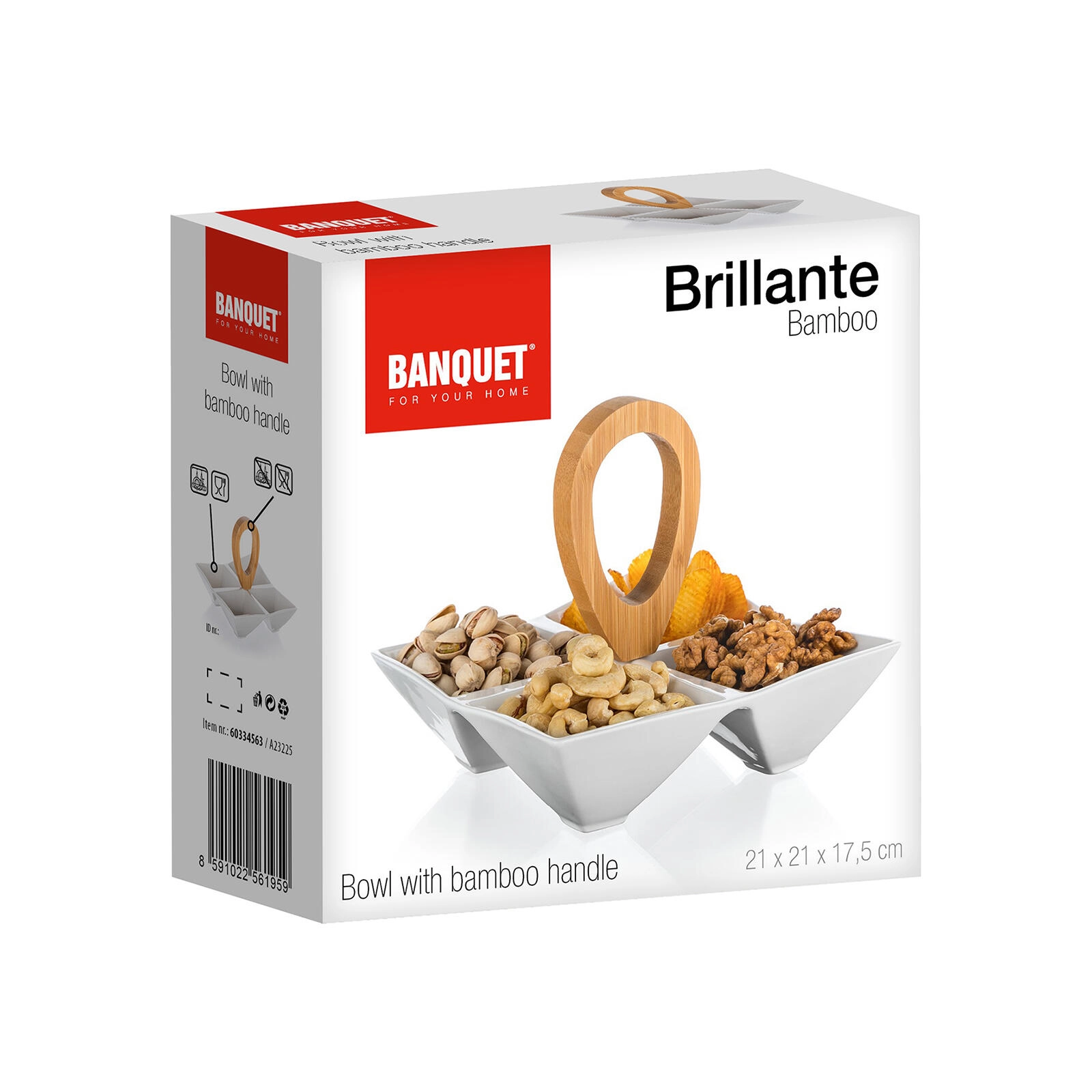 Create neat and elegant serving with the BRILLANTE divided bowl. Four square porcelain bowls provide clear separation for different snacks, while the central bamboo handle ensures safe and comfortable carrying from kitchen to table. Timeless white ceramic stands out in both modern and classic interiors.
