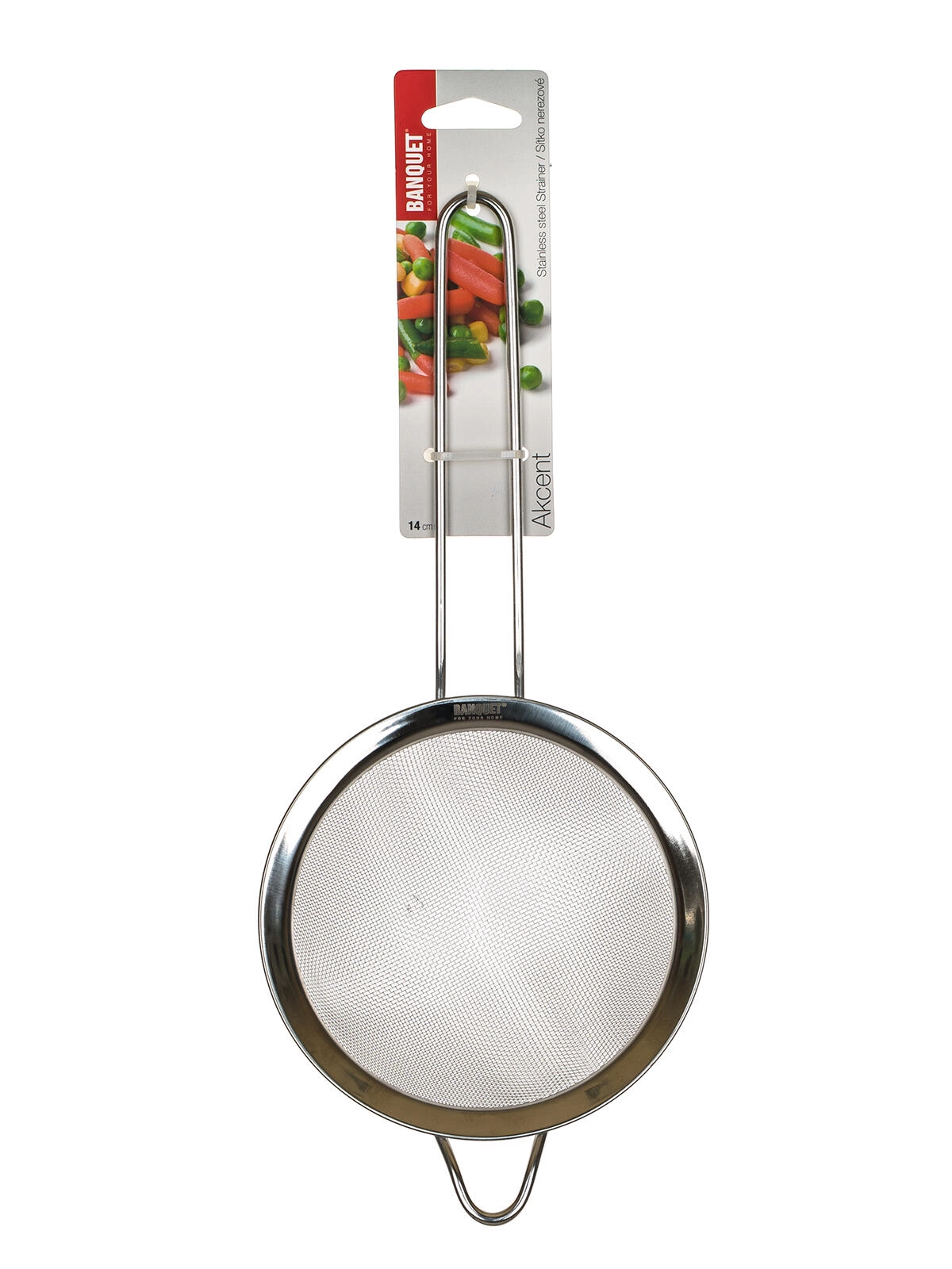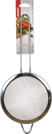 The practical AKCENT kitchen strainer with a diameter of 14 cm is ideal for straining liquids, rinsing ingredients, and fine filtration. Durable stainless steel construction, a comfortable metal handle with a hanging loop, and a fine 0.28 mm mesh with a density of 20 holes/cm² ensure a clean and quick result for everyday cooking.