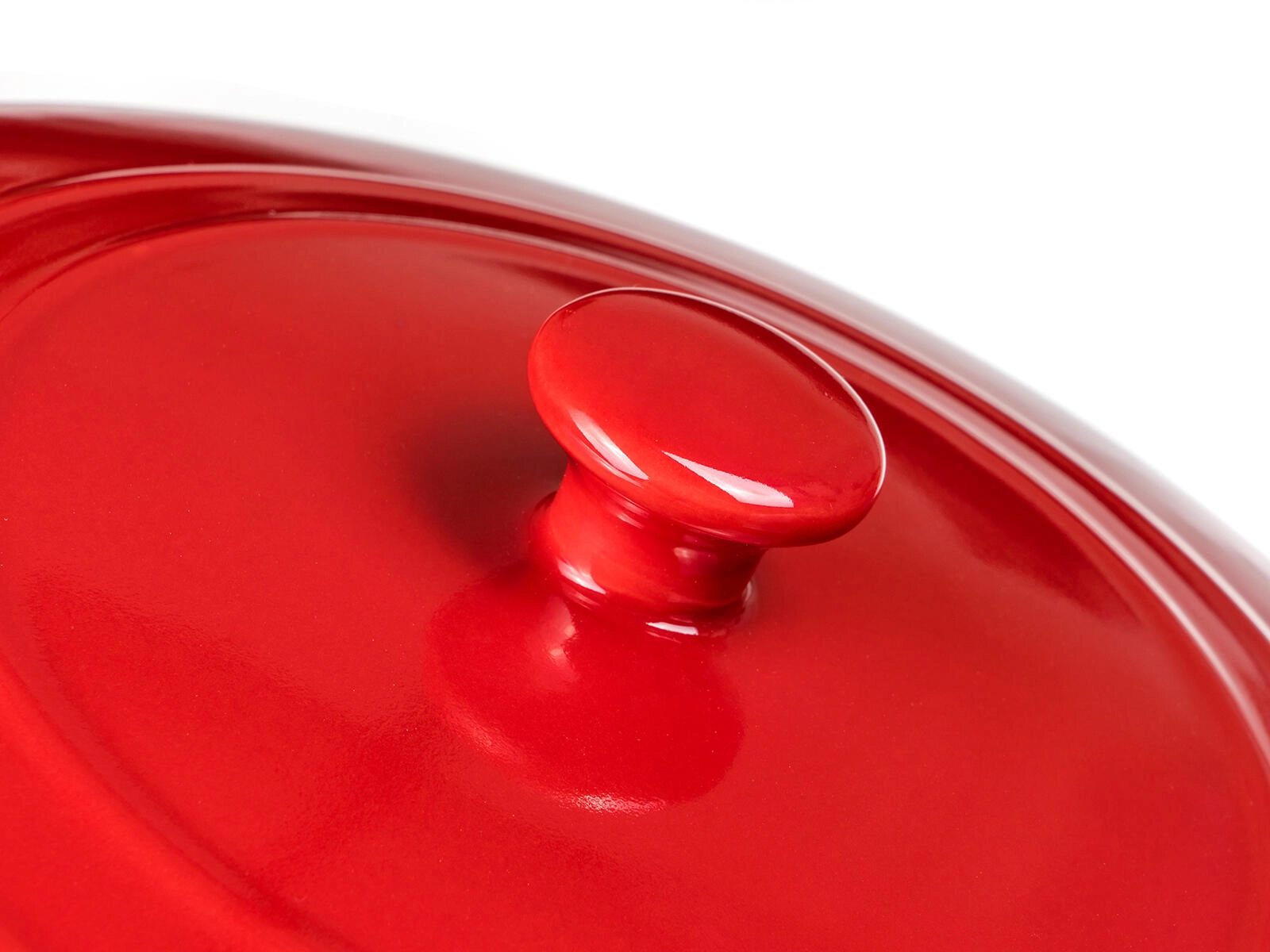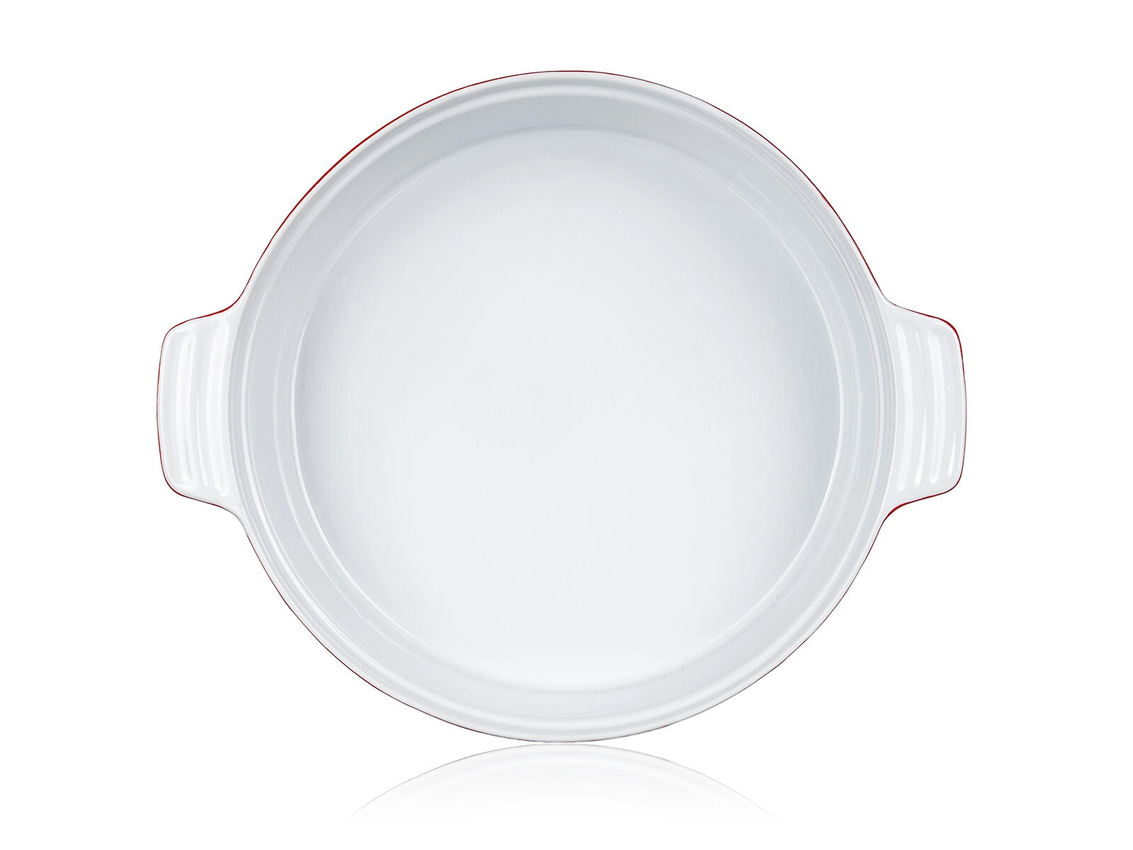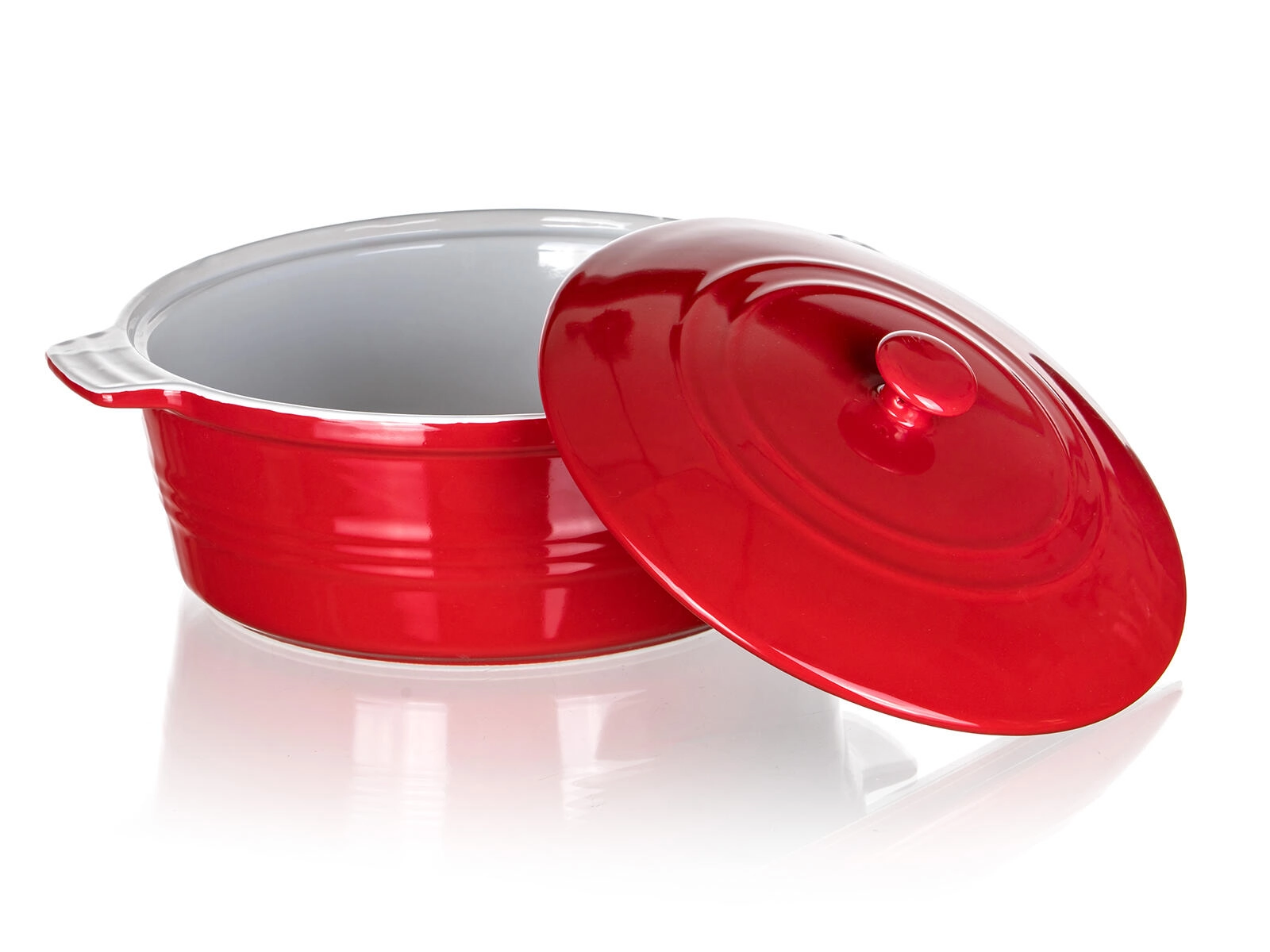 This high-quality round baking dish with lid from the CULINARIA range is great for lasagna, baked pasta, meat, and vegetables. The ceramic material gradually stores and releases heat, so food cooks evenly and stays juicy. The stylish red exterior with a white interior goes straight from the oven to the table.