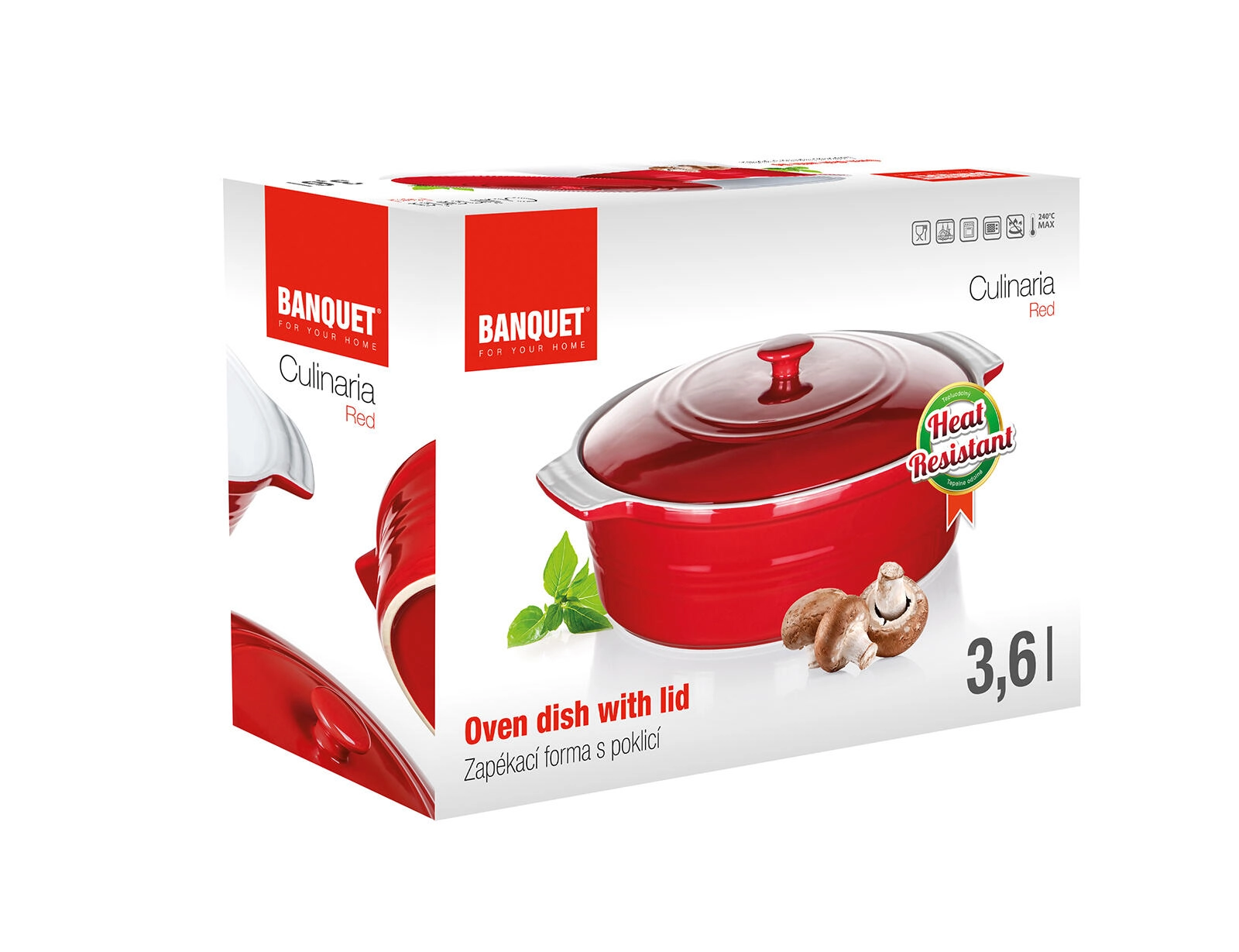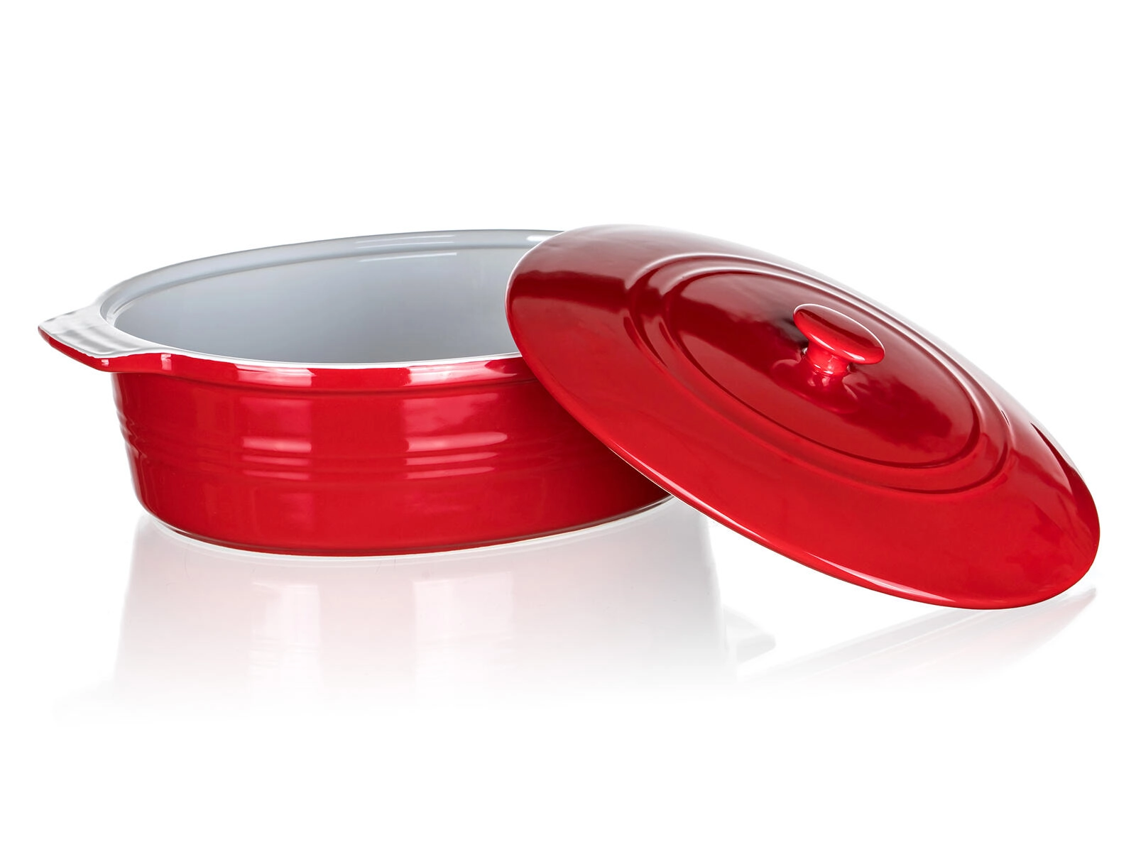 Practical oval CULINARIA baking dish with lid for perfectly juicy and evenly baked dishes. Thanks to the high-quality ceramic, it retains heat brilliantly and releases it gradually. It has ergonomic handles for a safe grip, a non-porous glaze for easy cleaning, and an elegant red-and-white design for stylish serving straight from the oven to the table.