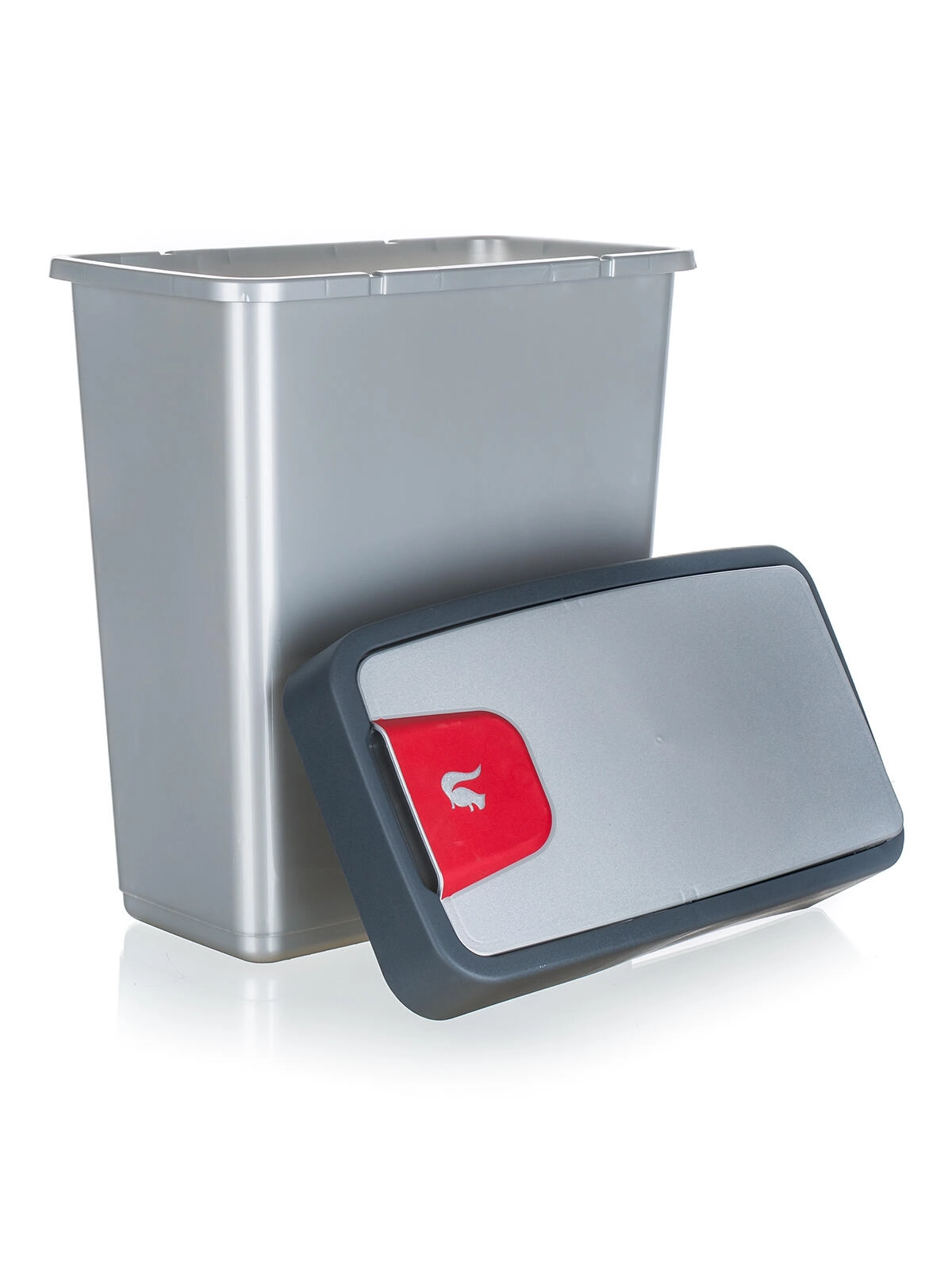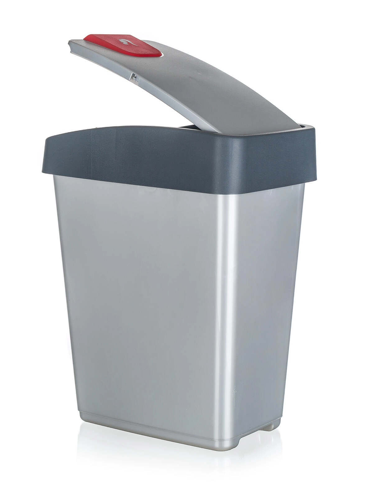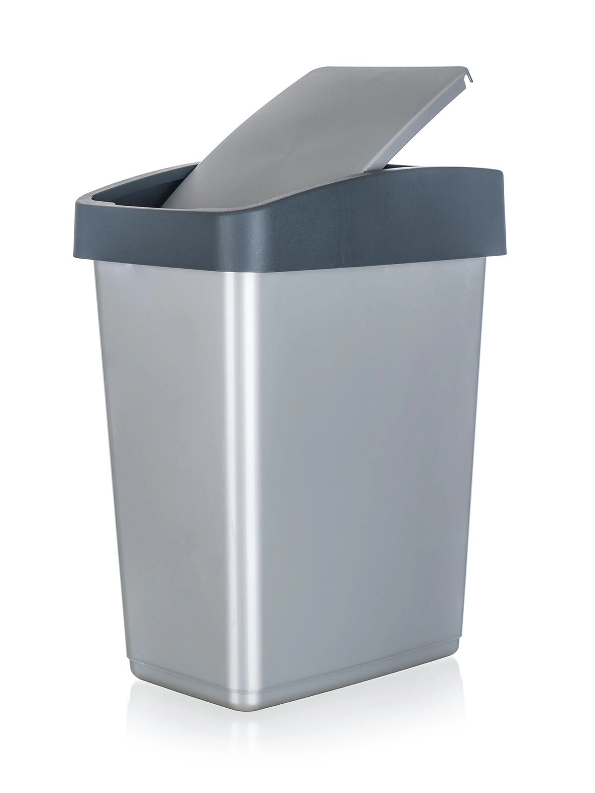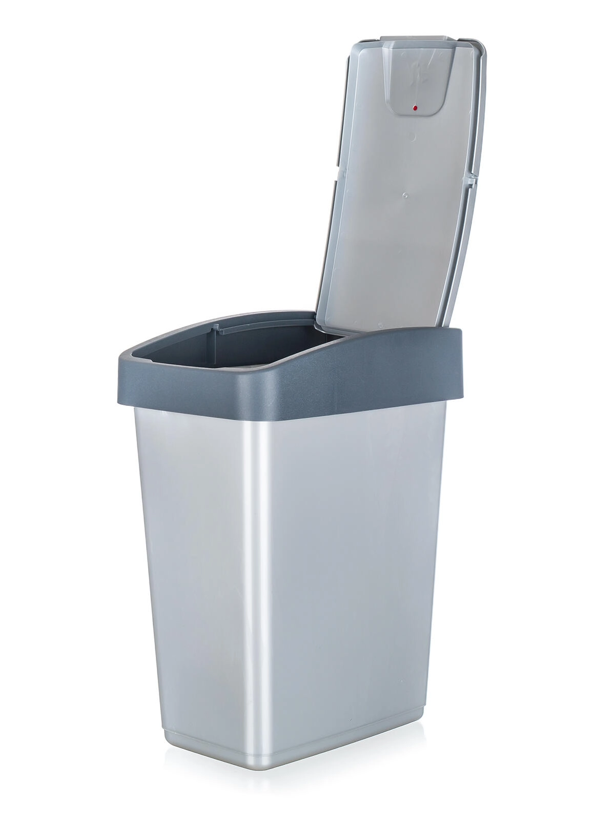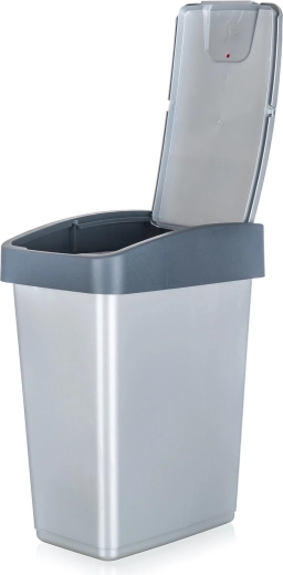 A practical 25 L trash can in a modern silver–gray color is easy to maintain and saves space thanks to its rectangular shape. The lid with two modes allows for open use or a swing (push) function for convenient and hygienic waste disposal. The durable plastic construction is easy to clean and suitable for the kitchen, office, and home.