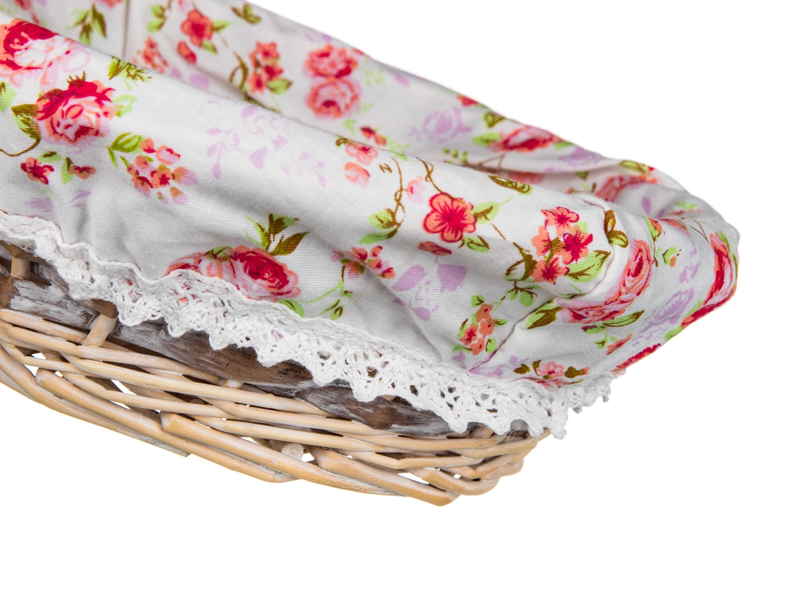 A charming round wicker basket with a removable cotton liner in white, featuring a pink floral pattern and a delicate lace trim. It stands out in romantic, country, and Scandinavian interiors and pairs easily with other home accessories.