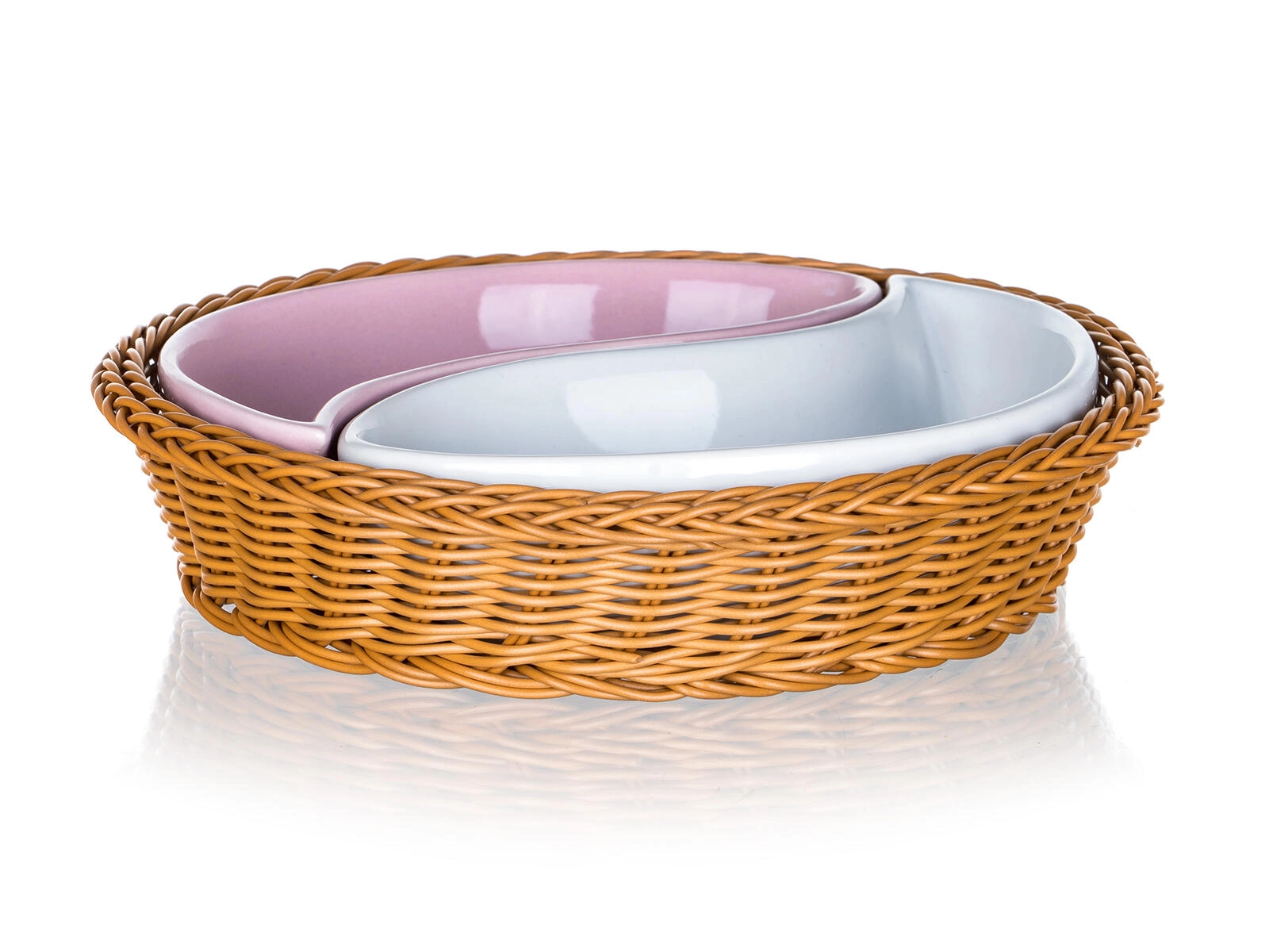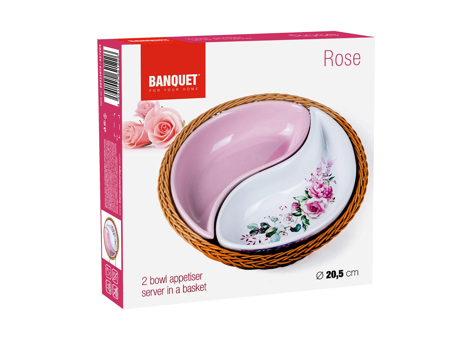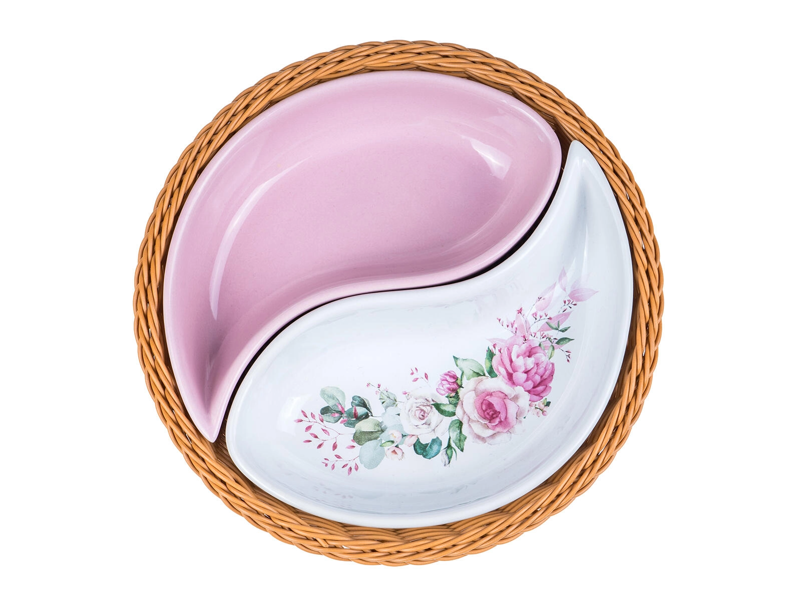 Elegant two-piece ROSE bowl set in a round wicker-style basket with a diameter of 20.5 cm combines glossy ceramic in pink-and-white glaze with a romantic floral motif. Ideal for serving snacks, nuts, dips, or sides, featuring a practical divided shape and easy maintenance.