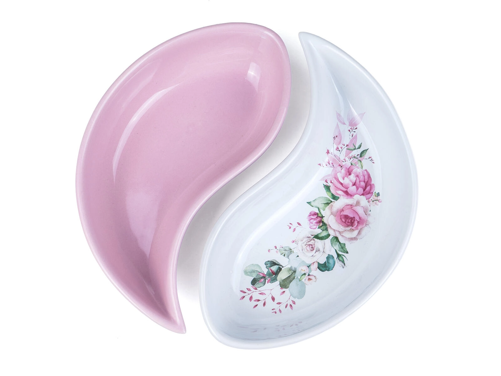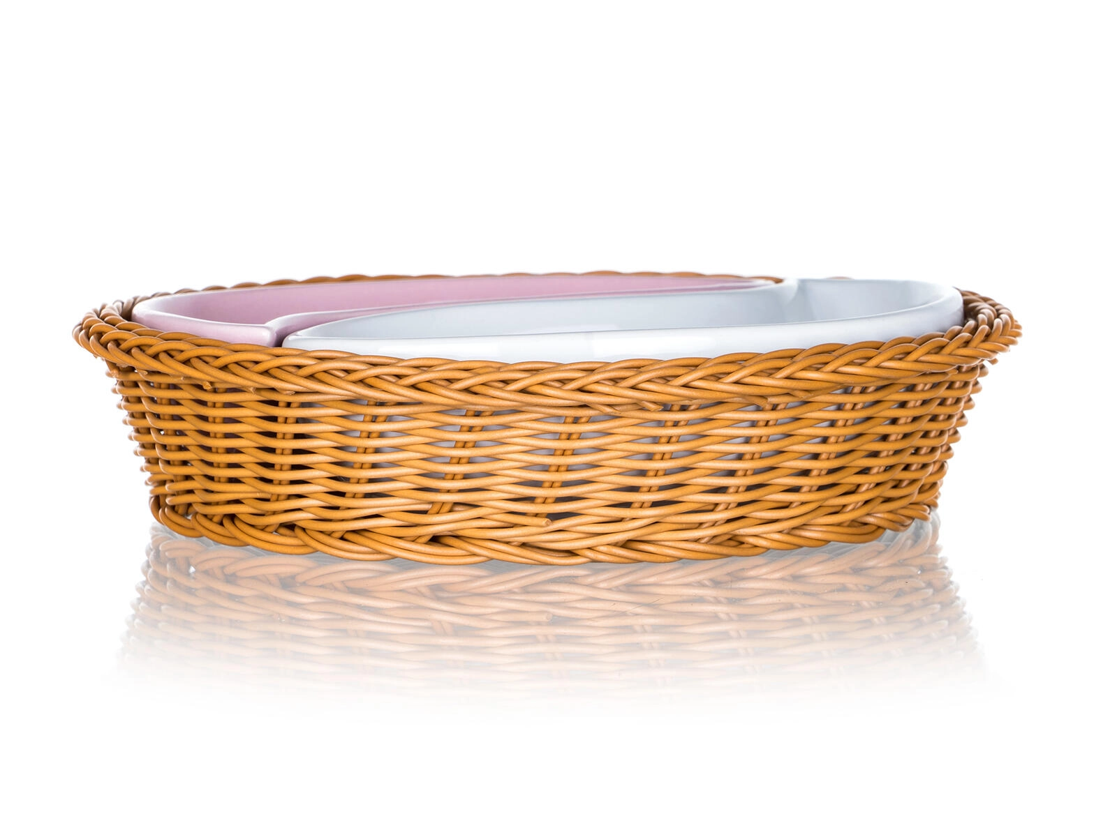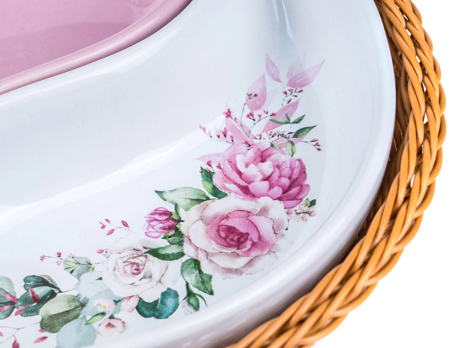 Elegant two-piece ROSE bowl set in a round wicker-style basket with a diameter of 20.5 cm combines glossy ceramic in pink-and-white glaze with a romantic floral motif. Ideal for serving snacks, nuts, dips, or sides, featuring a practical divided shape and easy maintenance.