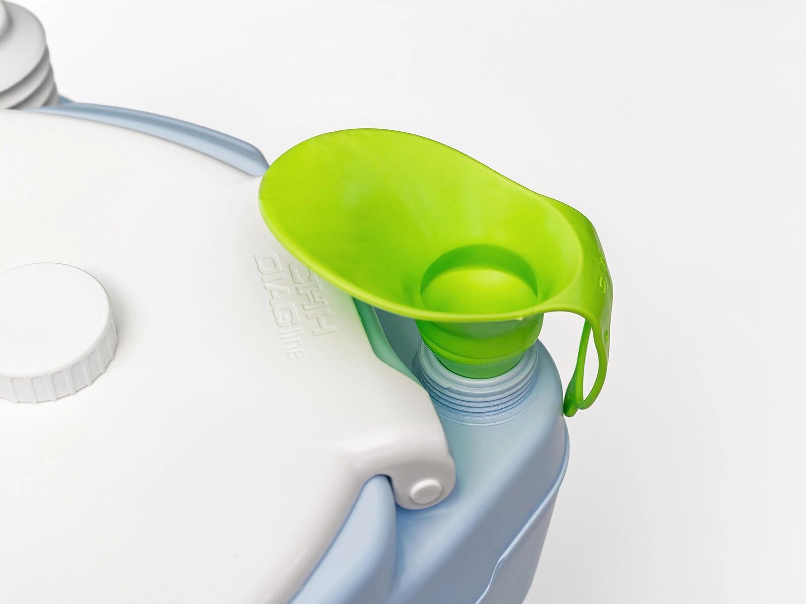 For easy handling, the toilet is equipped with a filling funnel for adding chemicals and liquids to the WC and a practical compartment for toilet paper or a phone. An ideal solution for camping, RV travel, boats, and home use for people with limited mobility.