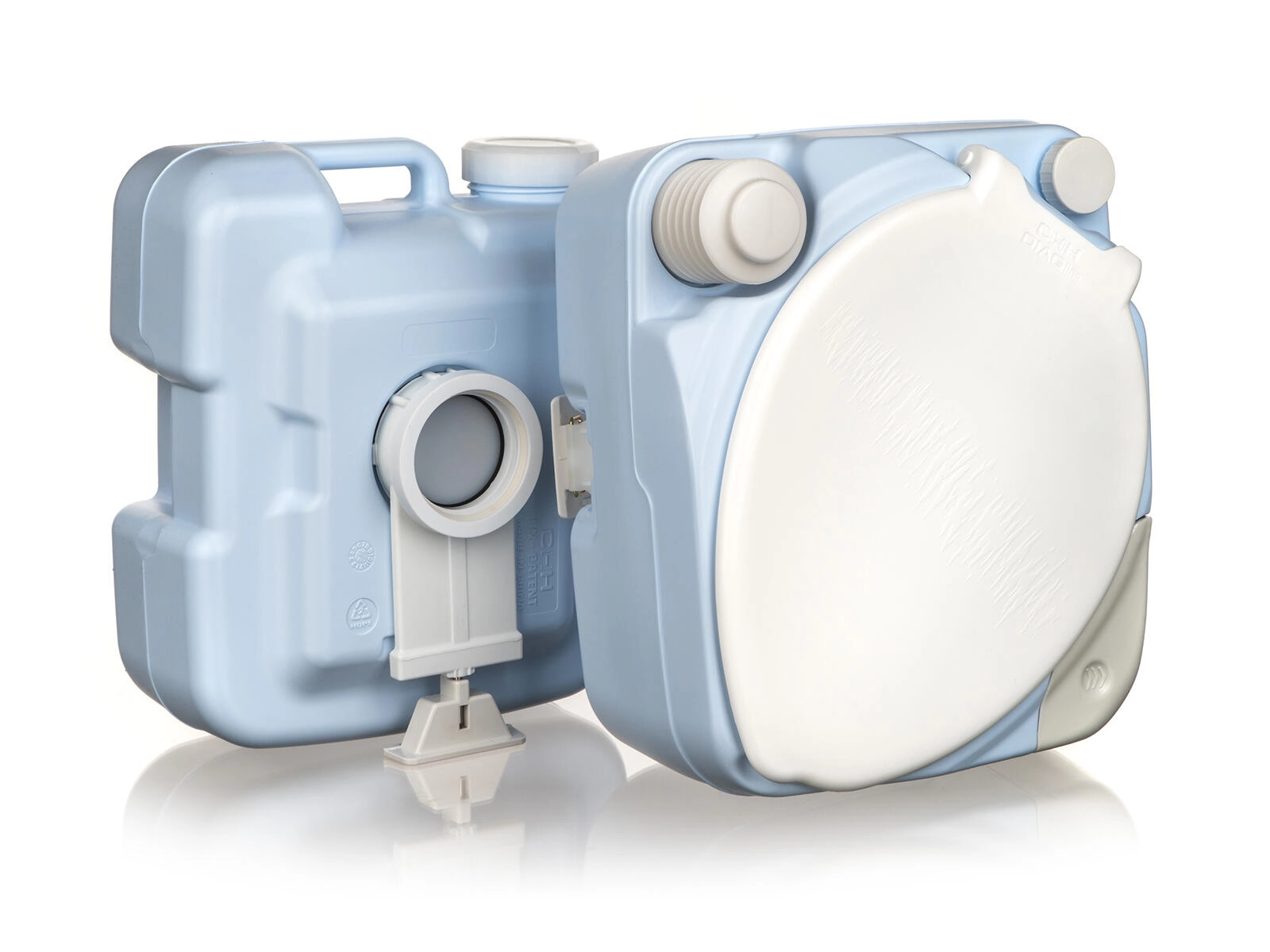 The toilet has a 15 l waste tank and an 11 l fresh water tank, providing ample capacity for multi-day stays. New rounded lines, a white seat, and lid enhance the feeling of cleanliness, while the reinforced tank bottom increases load capacity and durability during frequent transport. The diagonal shape allows space-saving corner placement even in smaller spaces.