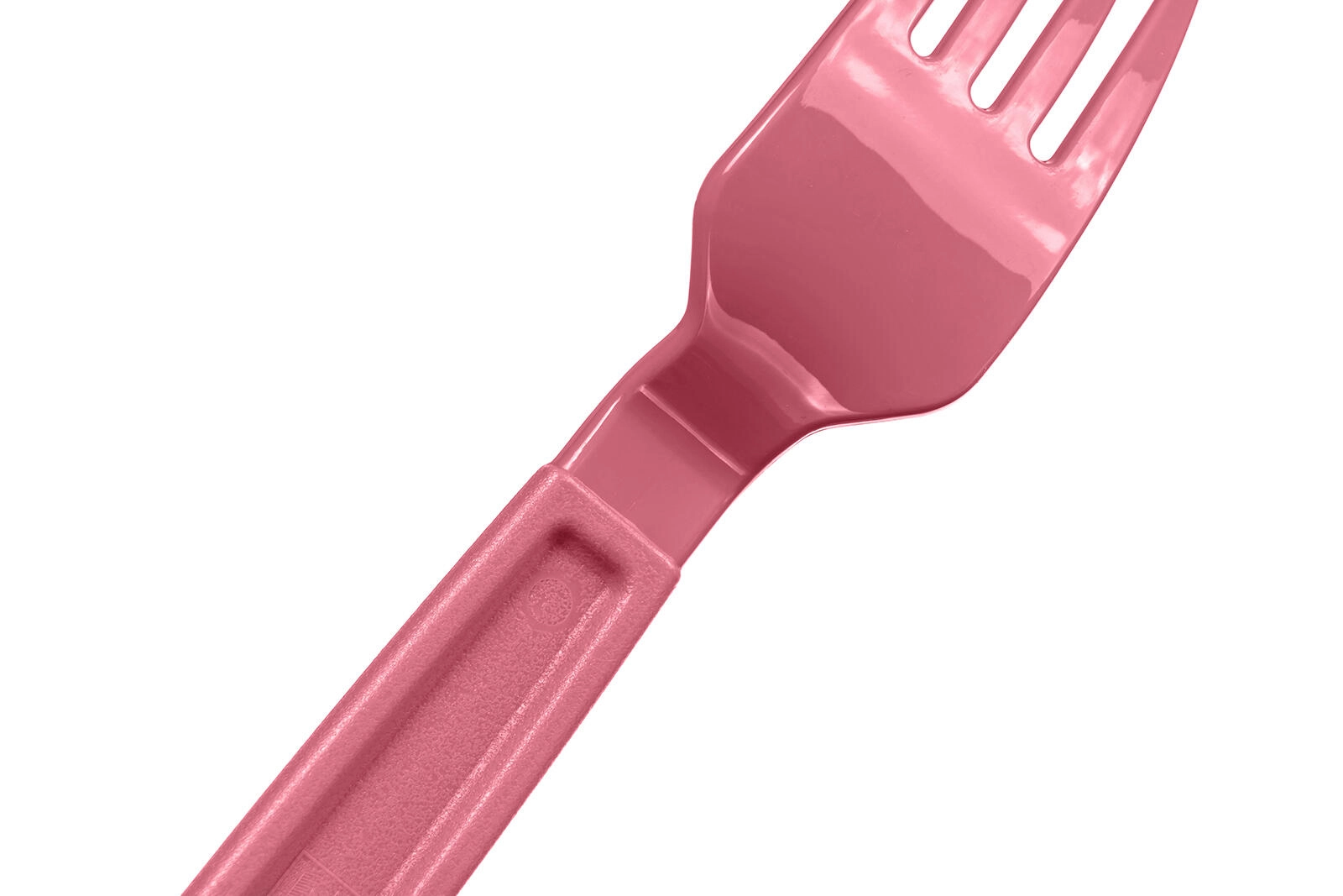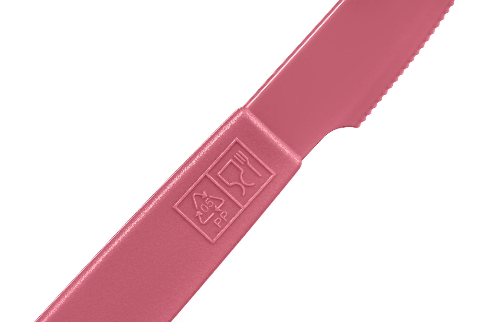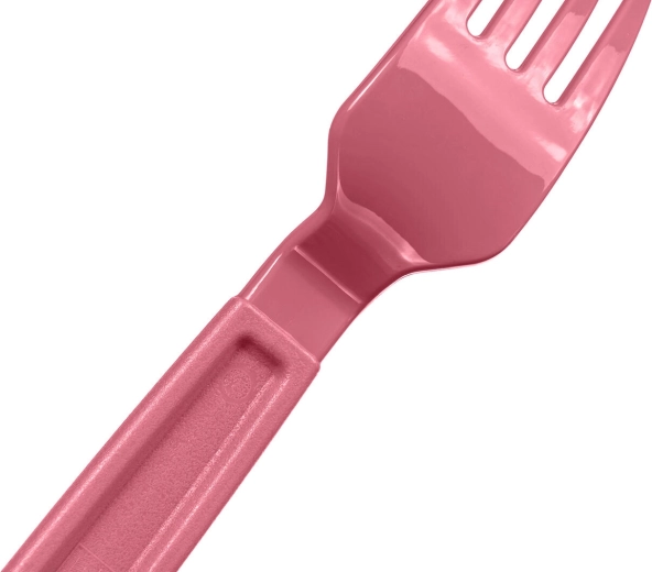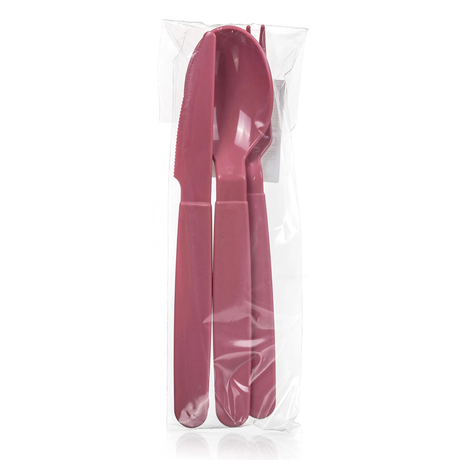 A stylish set of cutlery made of durable plastic in dark pink, ideal for everyday use, picnics, and camping. Includes a fork, knife, and spoon with a comfortable grip and a lightweight, easy-to-clean design. A perfect choice for garden parties, celebrations, and family trips.
