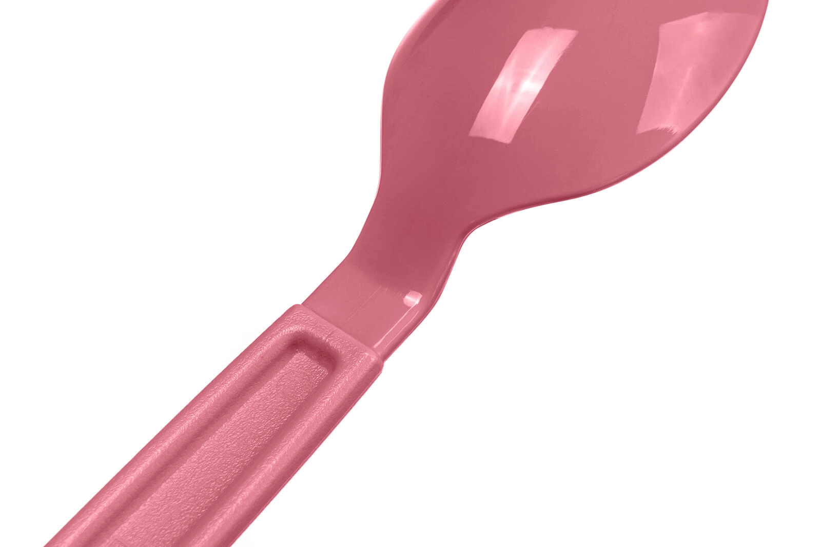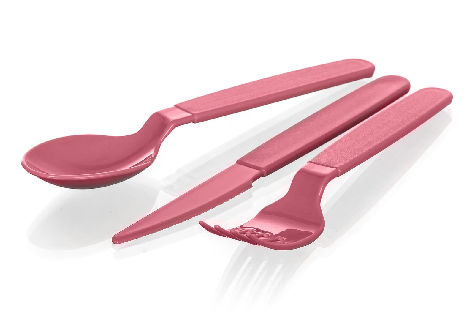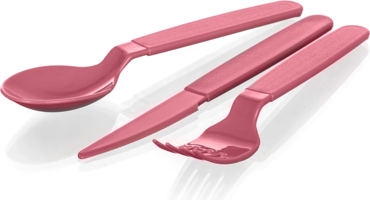 Three pieces in a unified design: spoon, knife, and fork in dark pink for a coordinated table at home or outdoors.