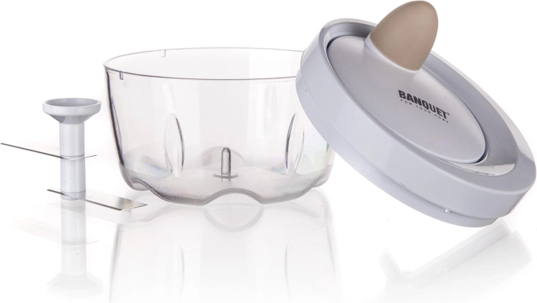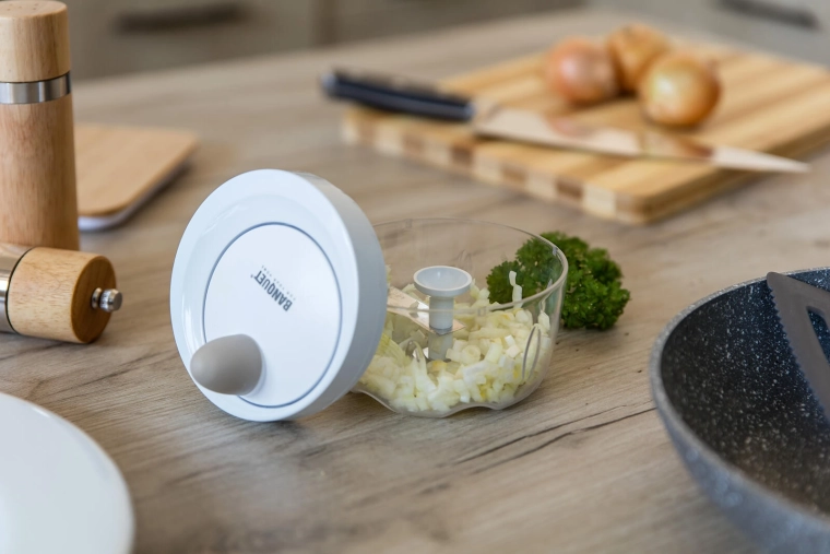 The mechanical pull-cord drive spins the stainless-steel blades in seconds. Ideal for onions, herbs, and fruit.