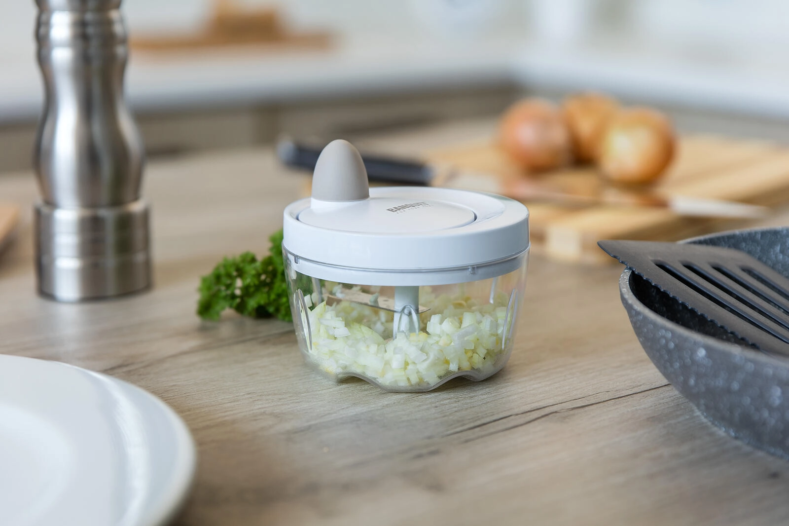 The compact manual mini chopper Culinaria Latte with a transparent bowl and sharp stainless-steel blades quickly chops fruit, vegetables, and herbs into small pieces. The parts are easy to clean and, thanks to the practical pull-cord lid, chopping is fast and electricity-free.
