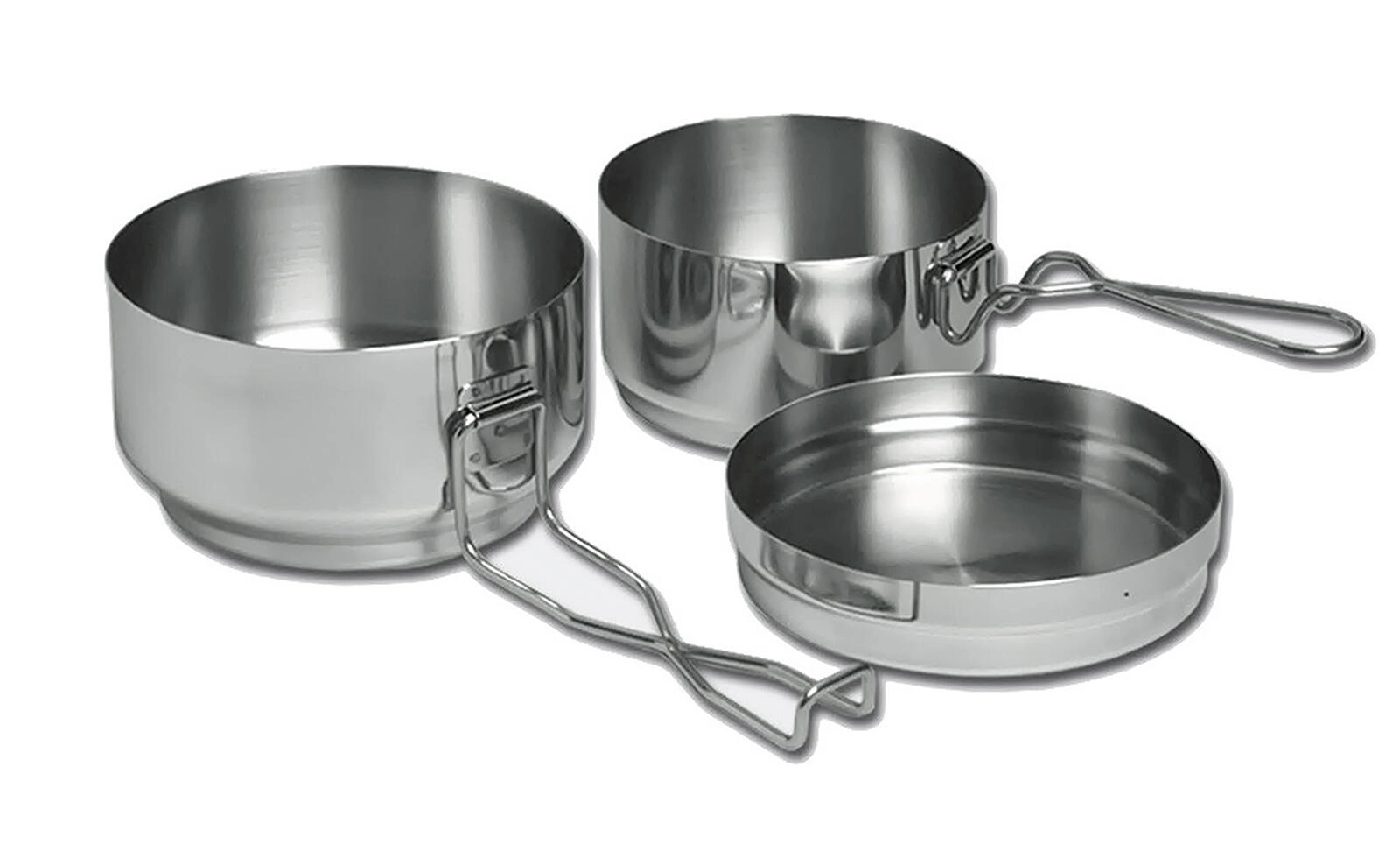 Practical 3-piece stainless steel camping set for cooking and serving outdoors. Includes two bowls/mess tins with folding handles and a lid, offers 1.4 l and 1 l capacity, is durable, easy to clean, and thanks to its compact stackable design saves space in your backpack.