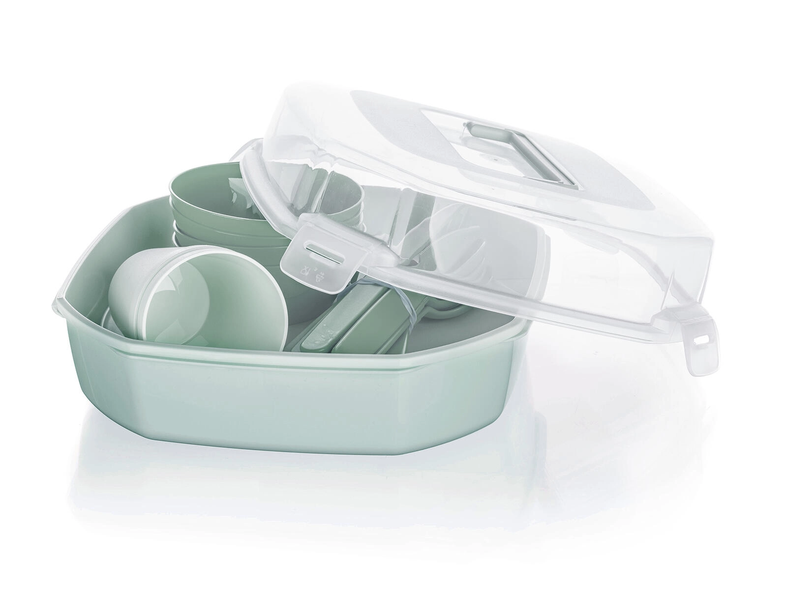 Enjoy comfortable dining on the go with this 26-piece camping dining set in mint. The lightweight plastic kit includes plates, bowls, cups, and cutlery for four people, all stored in a practical lockable container for easy transport and storage.