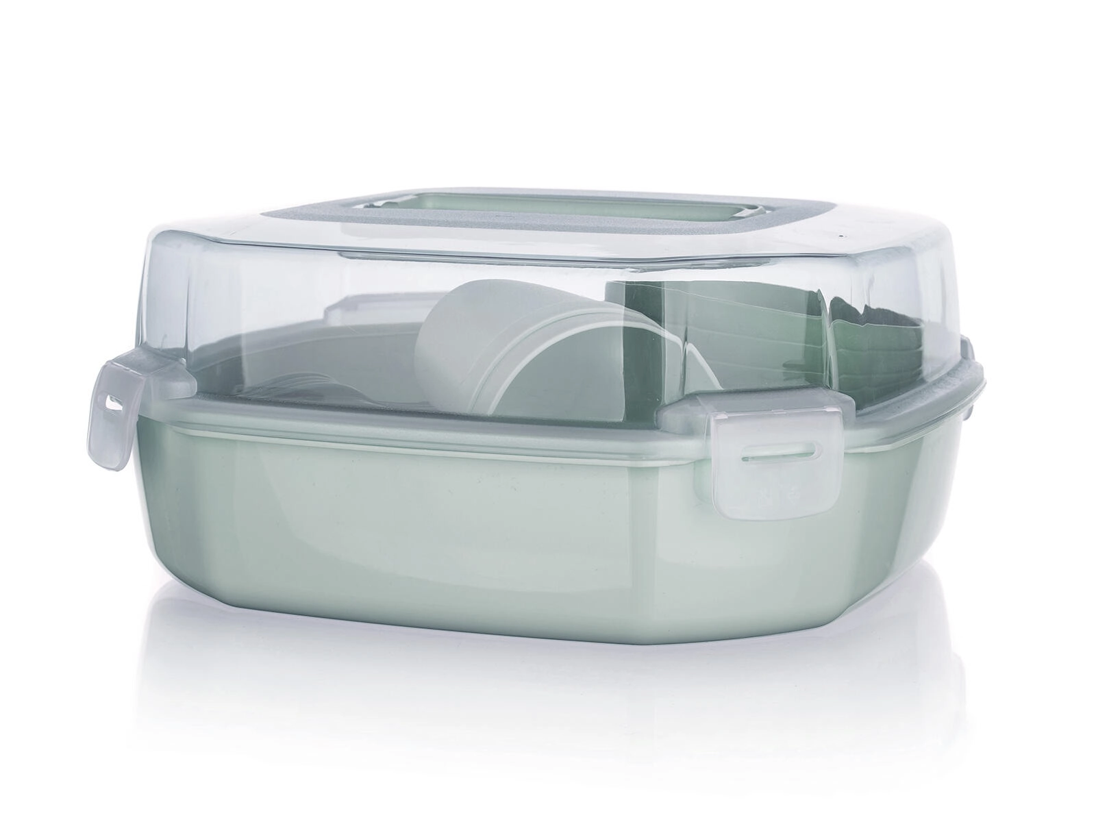 Store all tableware in a portable container with a lid. It keeps everything together, protects from dirt, and makes transport easier.