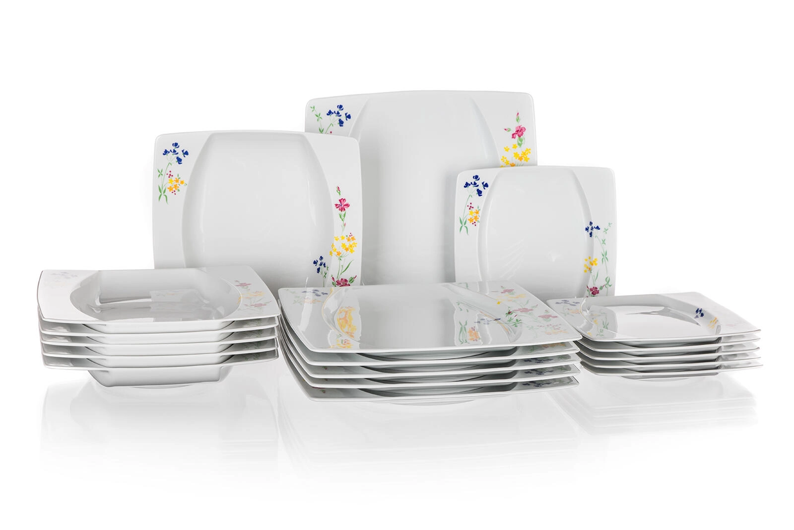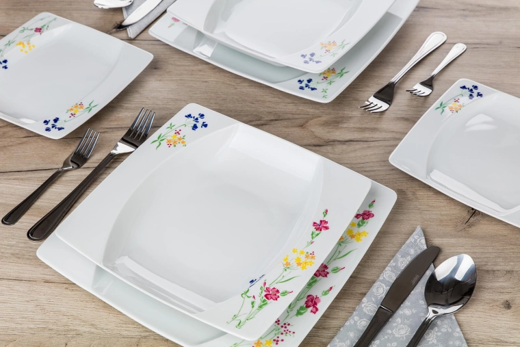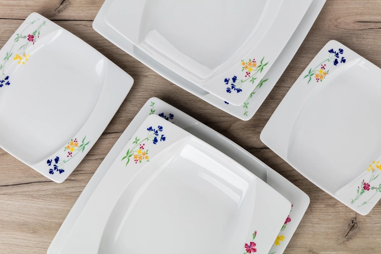 The set includes everything for complete serving—from soups and main dishes to desserts. The square shape with a slightly recessed center helps present dishes elegantly and prevents sauces from spilling over.