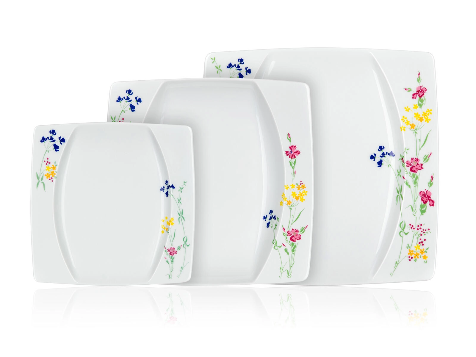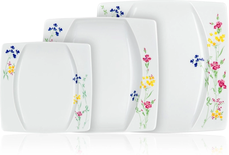This timeless square set combines elegant design with practical everyday use. The delicate floral motif on the edges and glossy glaze elevate both festive and daily dining. Thanks to durable THUN porcelain, the plates are easy to care for and retain their colors and shine over time.