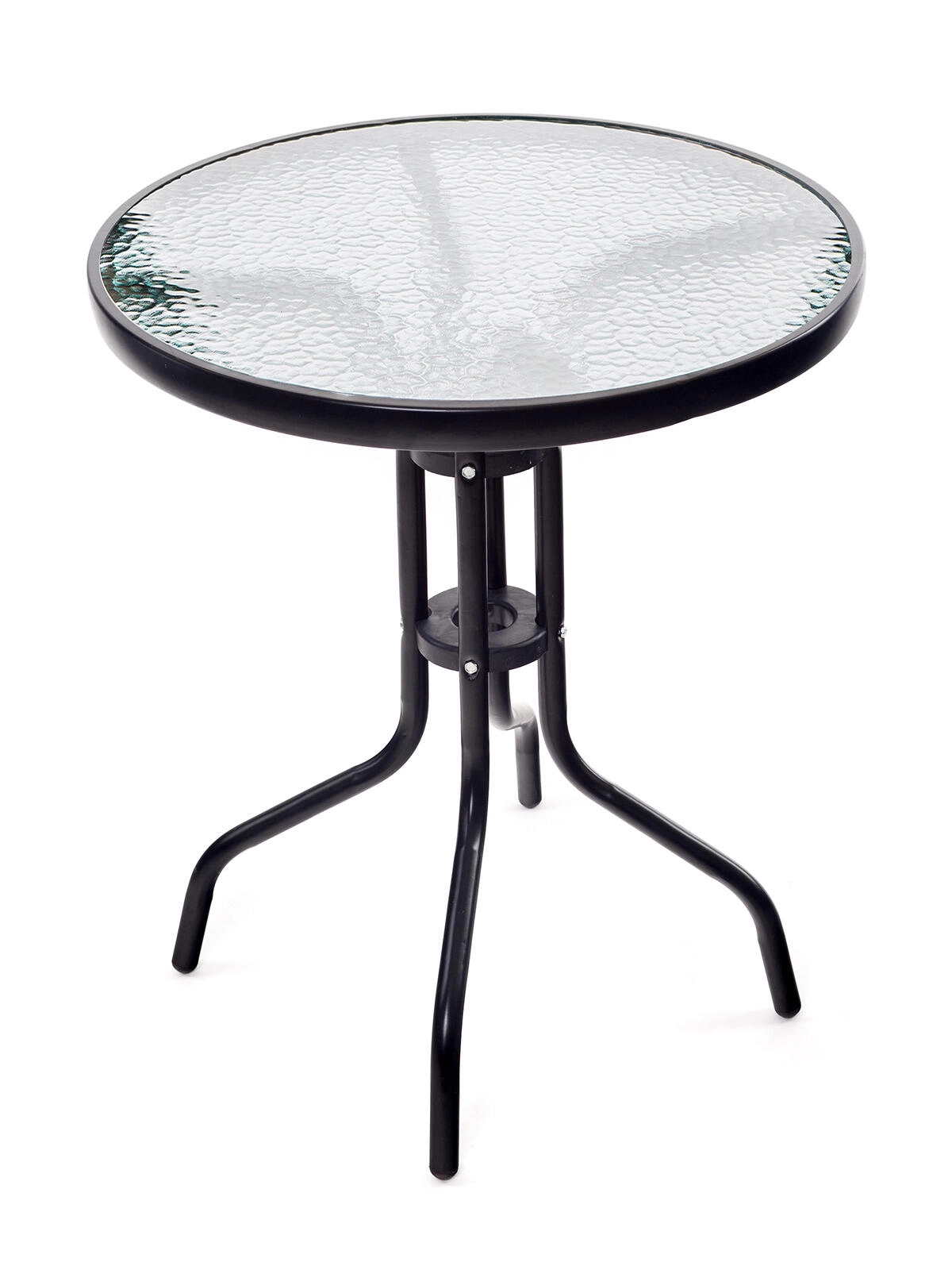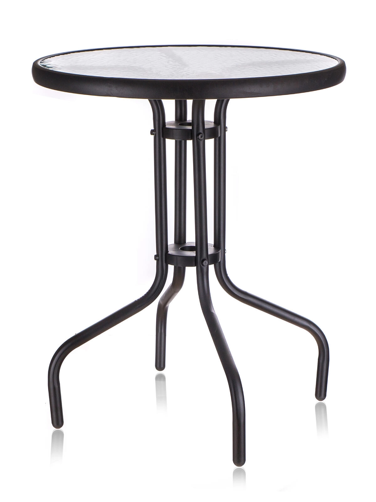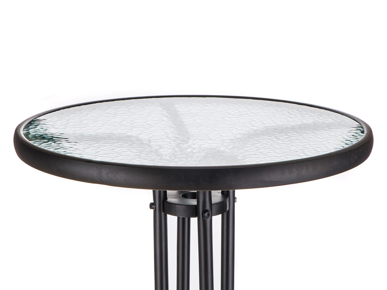 This stylish round table in black is an ideal choice for smaller outdoor areas. Thanks to its compact size, it works perfectly as a side table for seating, coffee, books, or flowers. The metal frame feels stable, while the textured glass top is easy to clean and stands up to everyday use.