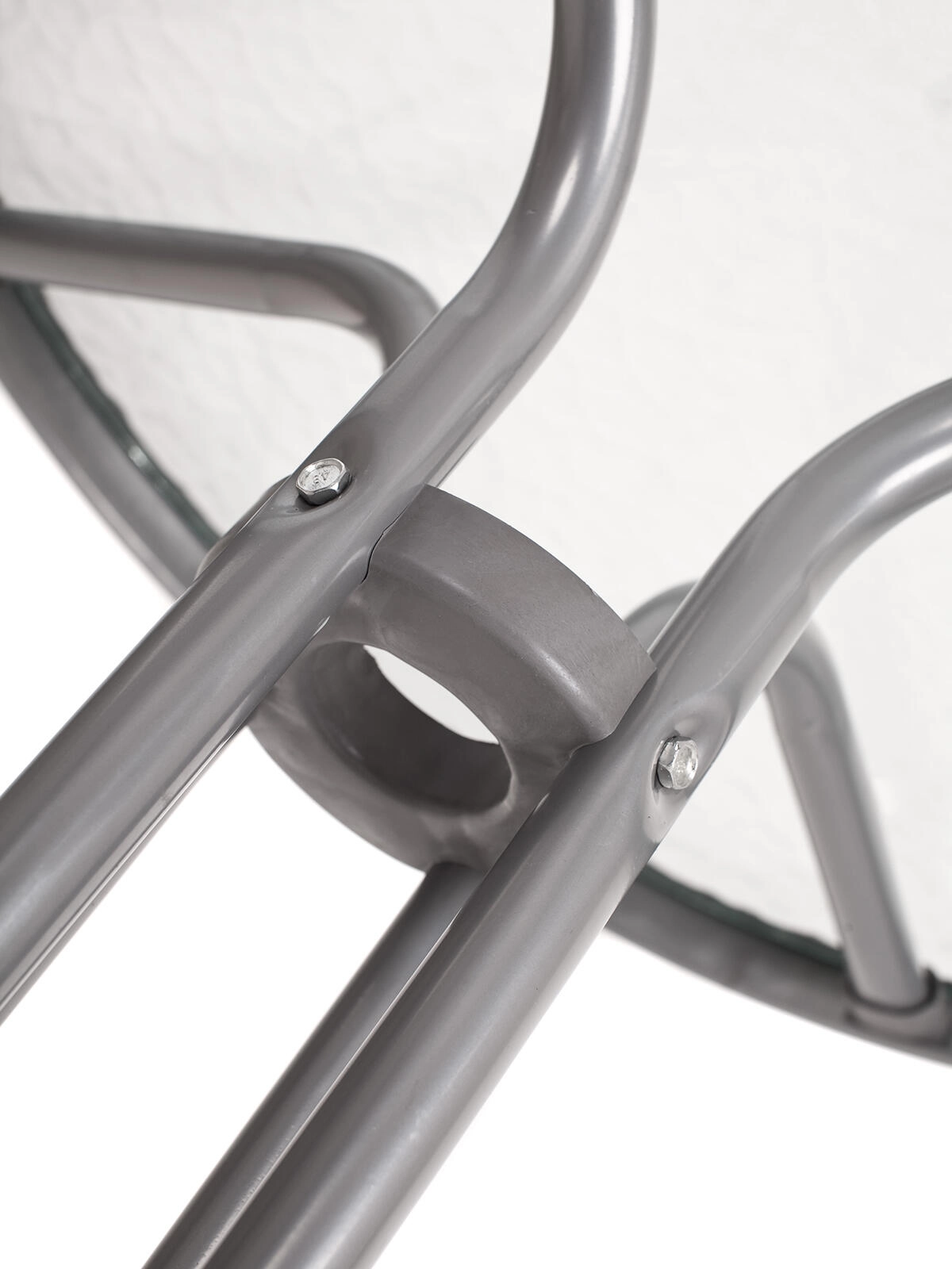 Elegant garden table with a glass top and a stable metal frame in a modern silver finish. Thanks to its compact dimensions and low weight, it is easy to carry and perfect for the patio, balcony, and garden.