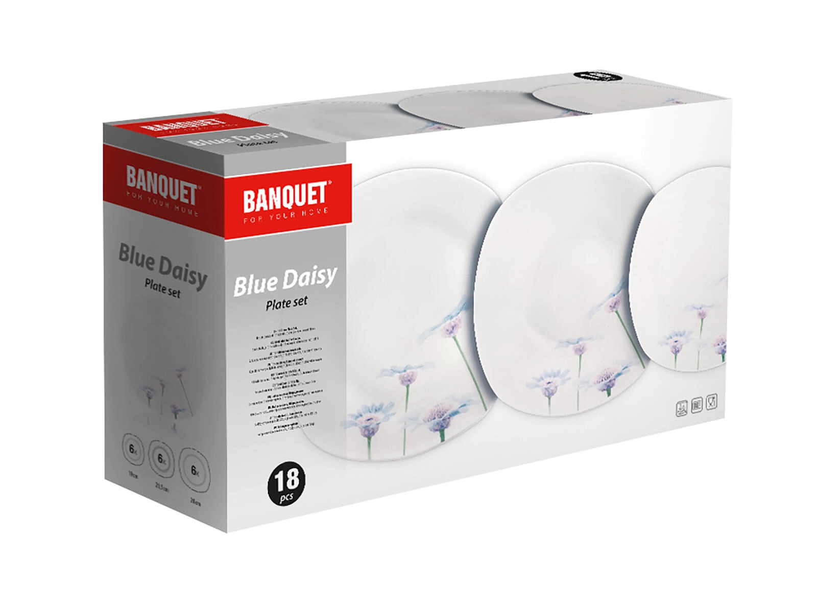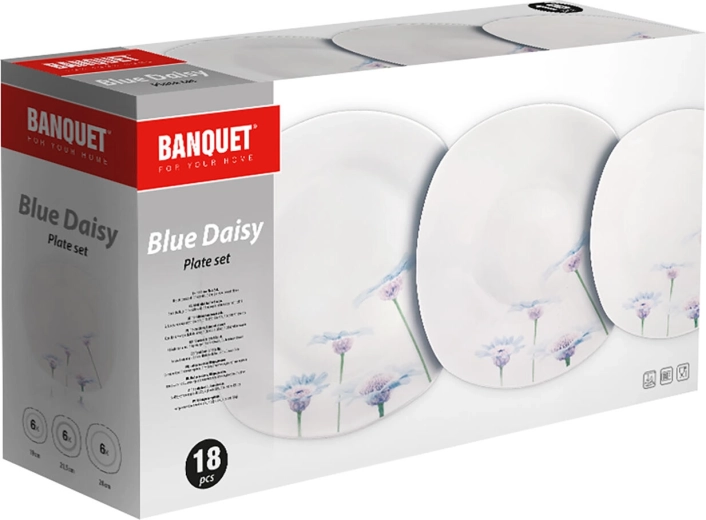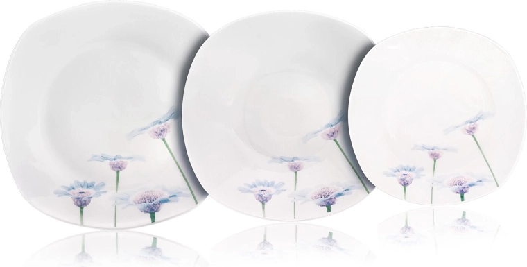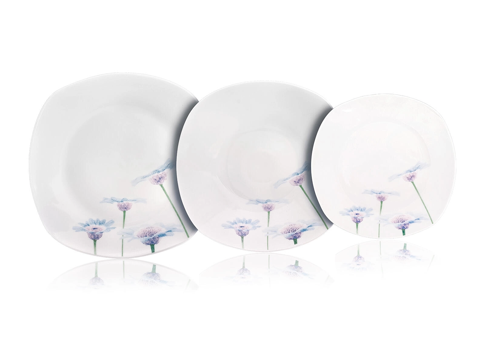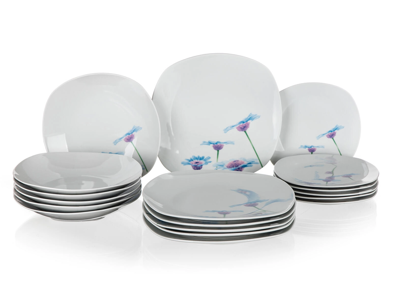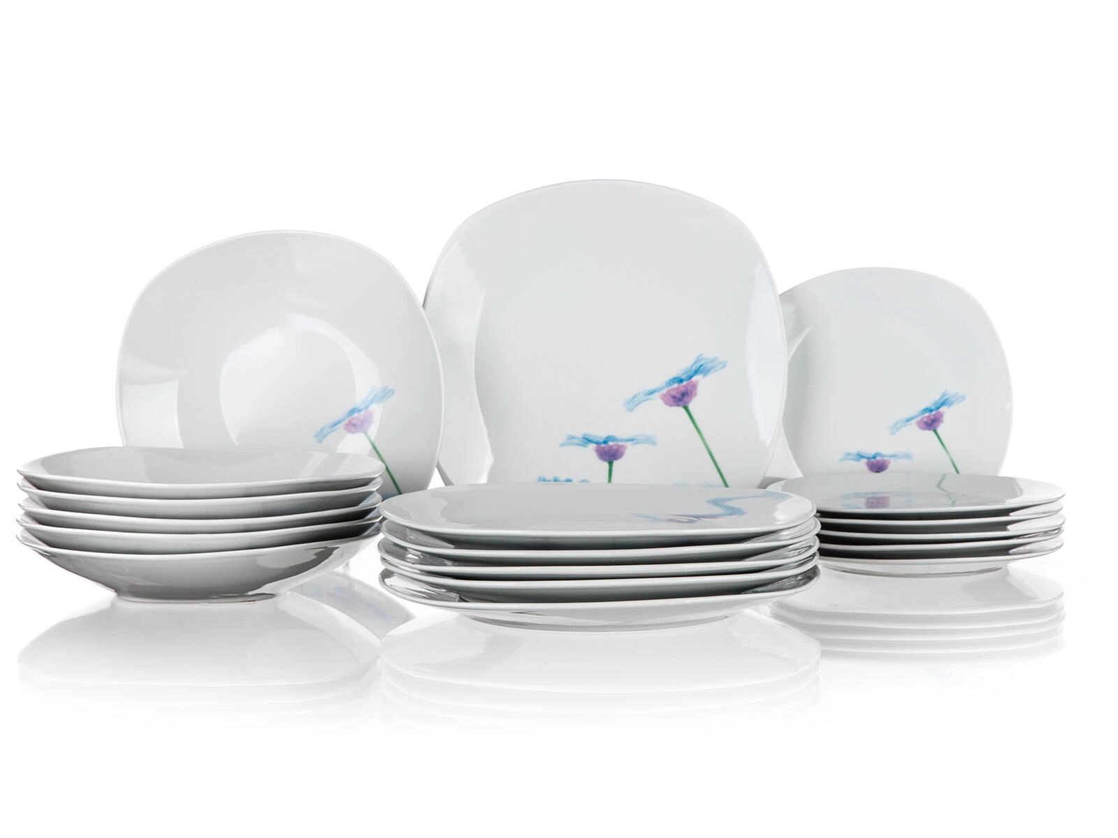 An elegant 18-piece porcelain dinner set with a delicate floral decor Blue Daisy that brightens any table. Thanks to the versatile plate sizes and durable glaze, it is ideal for everyday use as well as festive dining. The plates feature a modern rounded square shape, are microwave safe, and dishwasher safe.