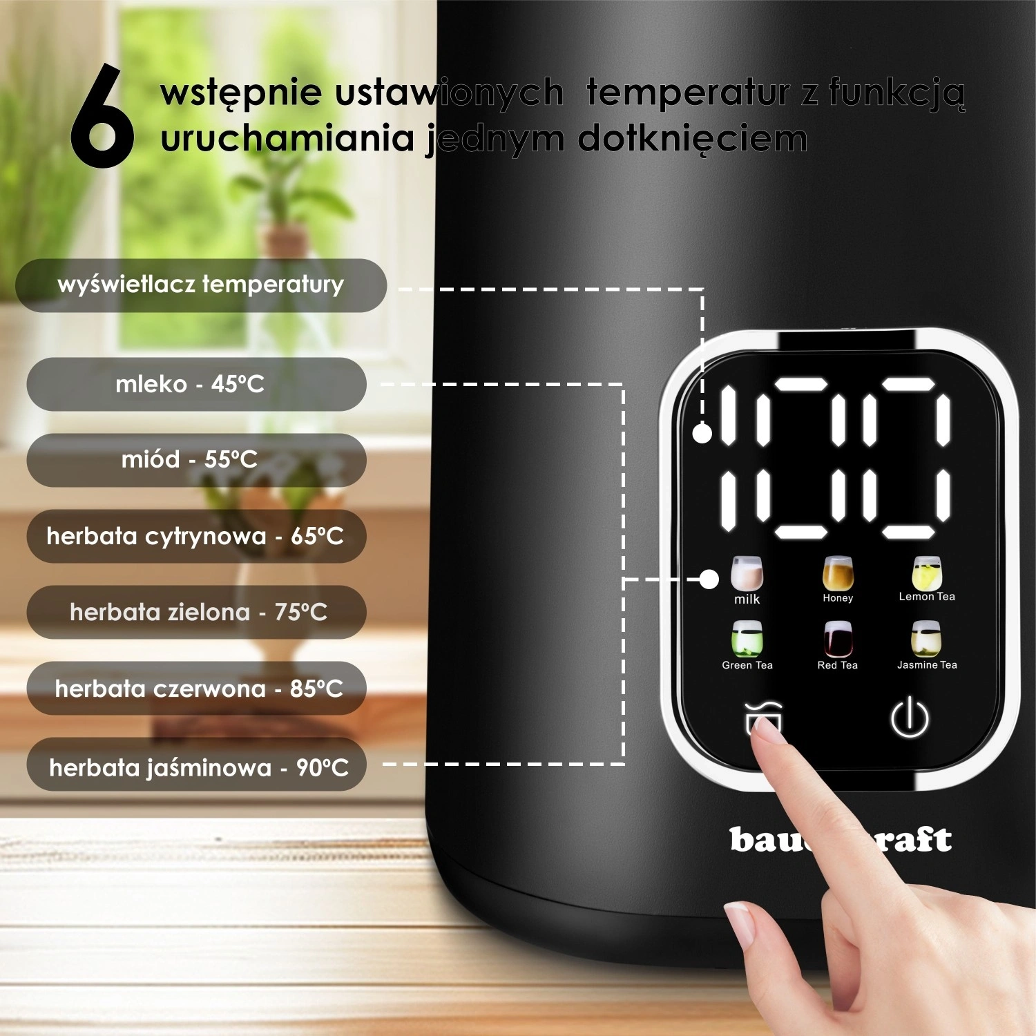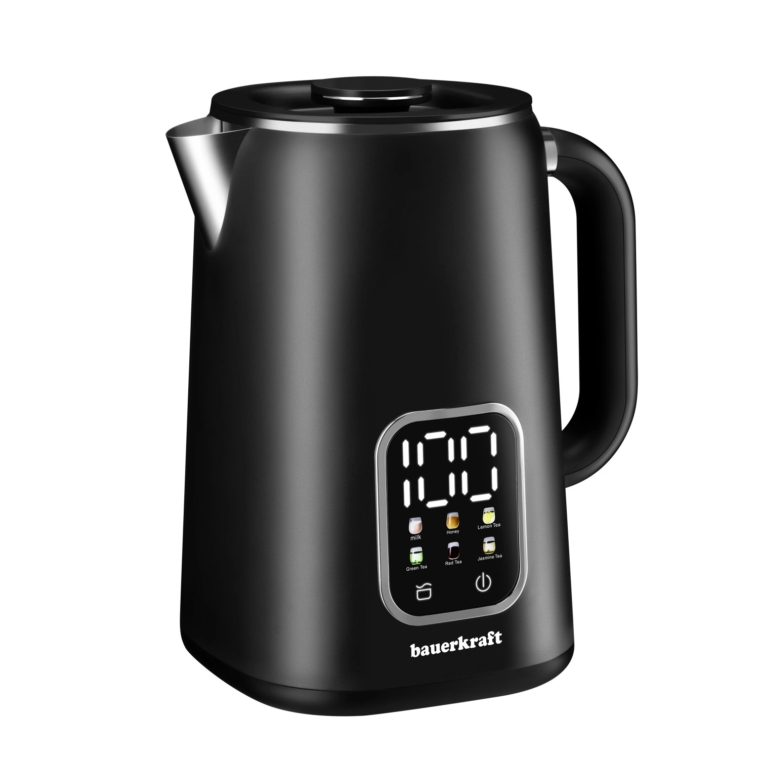 Enjoy fast, precise drink preparation thanks to the smart kettle with touch controls. Preset temperatures let you choose the ideal heat for different types of tea, coffee, milk, or honey. The double-wall design increases safety, keeps the exterior cooler to the touch, and maintains water temperature longer. With a 1.7 L capacity, it easily serves the whole family.