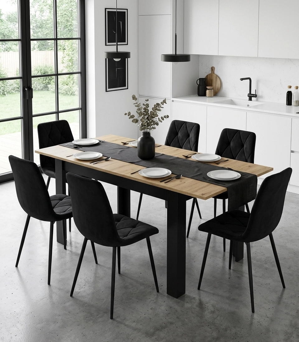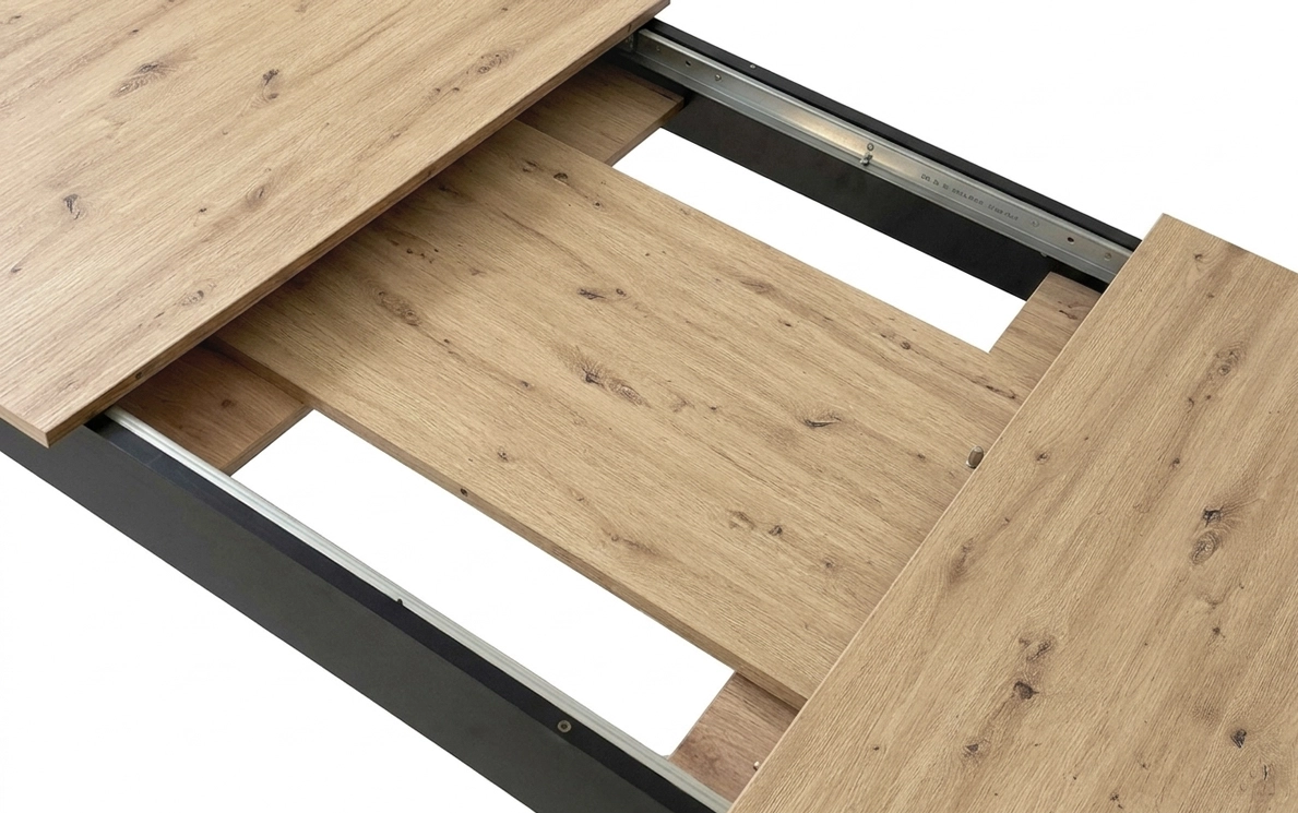 A stylish dining table with an extendable top from 120 to 160 cm provides comfortable space for 4–6 people. The combination of artisan oak decor and black legs suits both modern and loft interiors. The durable MDF top with PVC veneer is easy to maintain and scratch-resistant, while the stable construction ensures confidence in everyday use. A practical insert stored under the tabletop enables instant extension when guests arrive.