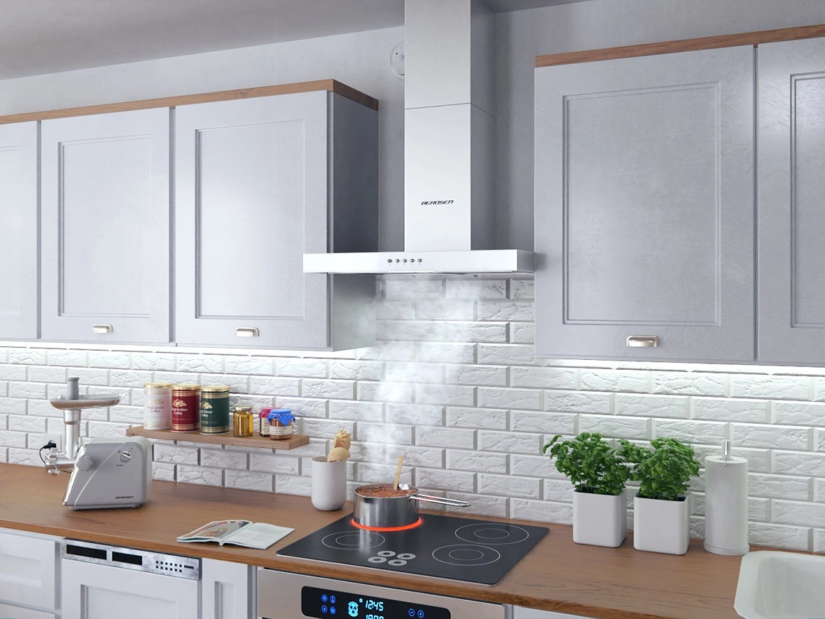 The hood offers 3 speedspush‑button control and 5‑layer aluminum grease filters that effectively trap grease. It can work as a ducted hood to a chimney or as a recirculation unit with an optional Berdsen TYP‑A carbon filter (available separately). Thanks to compact dimensions of 60 × 45 cm and an adjustable height of 45–75 cm, it adapts to various kitchen layouts.