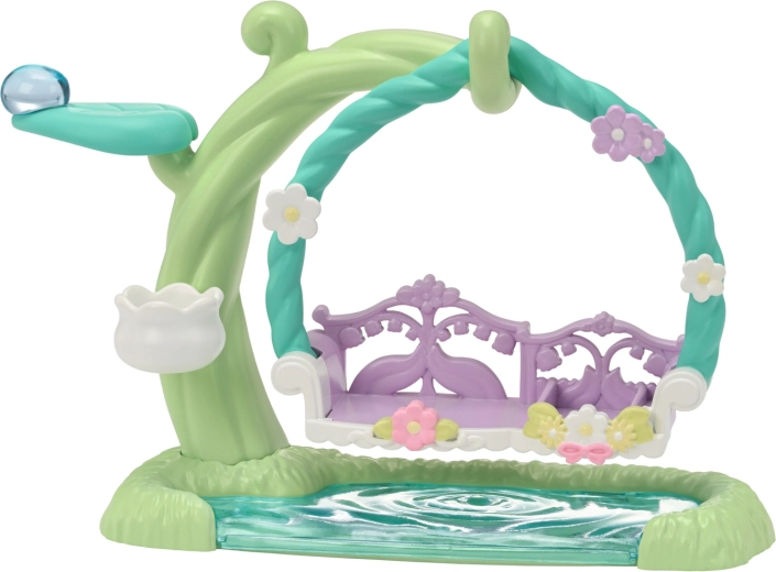 The figures feature a silky-soft surface, detailed outfits and movable parts for easy posing. Included is a decorative tree with a hanging bench swing and floral accessories. The set is ideal for solo play or as an expansion to the Sylvanian village.