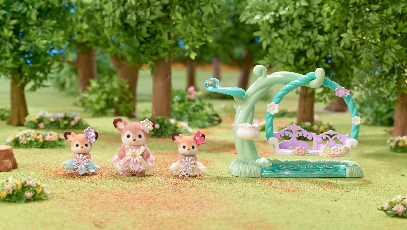 - 3 deer figures (Aster, Nova, Rose), flower swing with tree and pond base, floral accessories