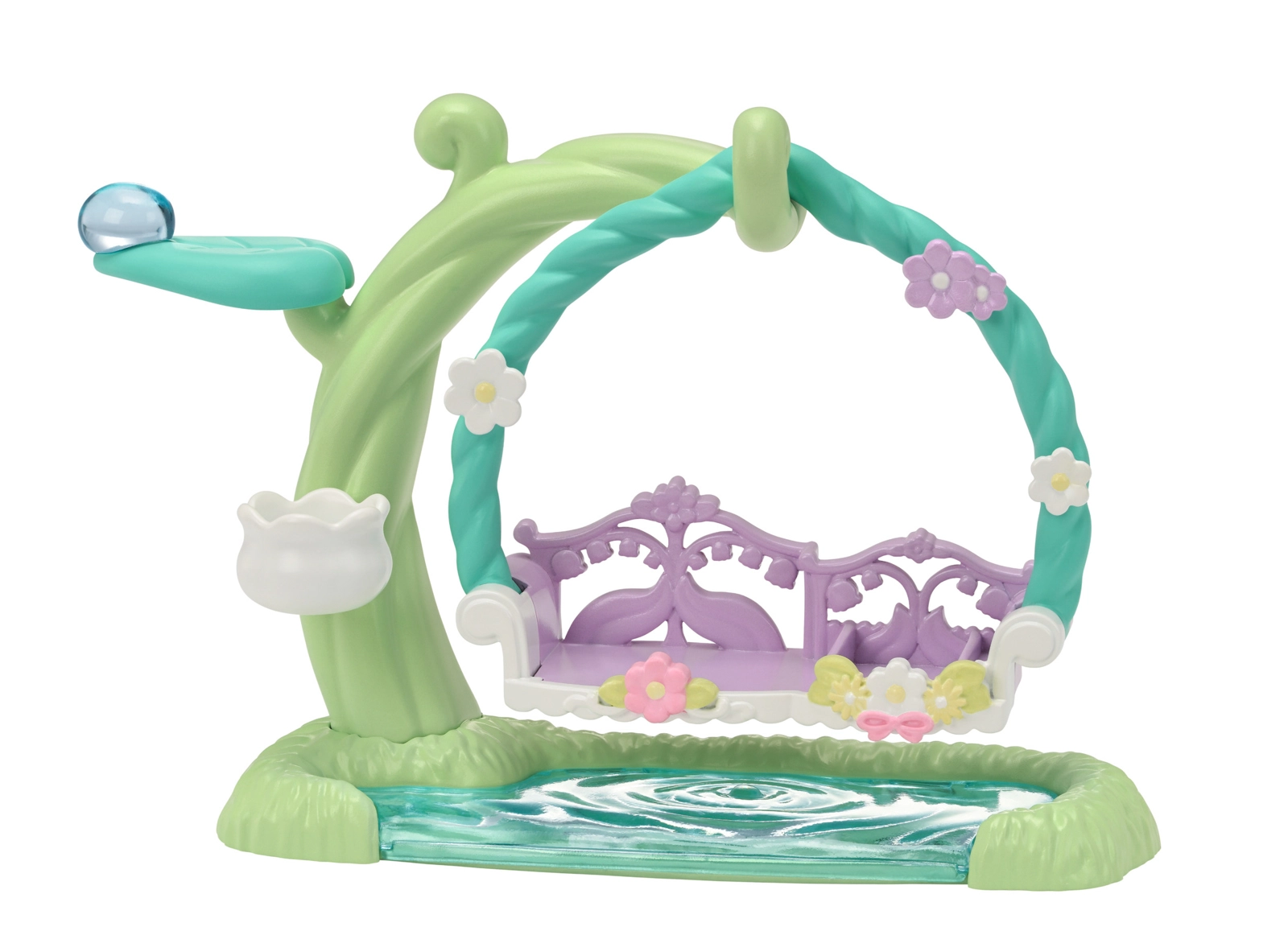 The hanging bench by the pond holds the figures and allows gentle back-and-forth swinging – ideal for calm play scenes and photos.
